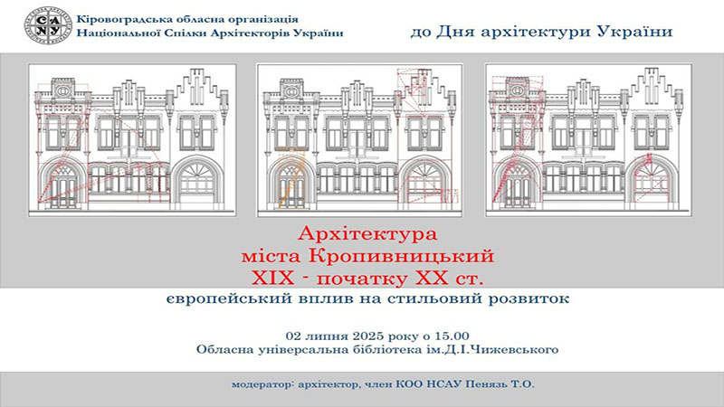 2 липня 2025 коку о 15:00 у відділі мистецтв бібліотеки імені Дмитра Чижевського відбудеться захід до Дня архітектури України – лекція-бесіда на тему «Архітектура міста Кропивницький XIХ – початку XX століття. Європейський вплив на стильовий розвиток», організований спільно з Кіровоградською обласною організацією Національної спілки архітекторів України.
