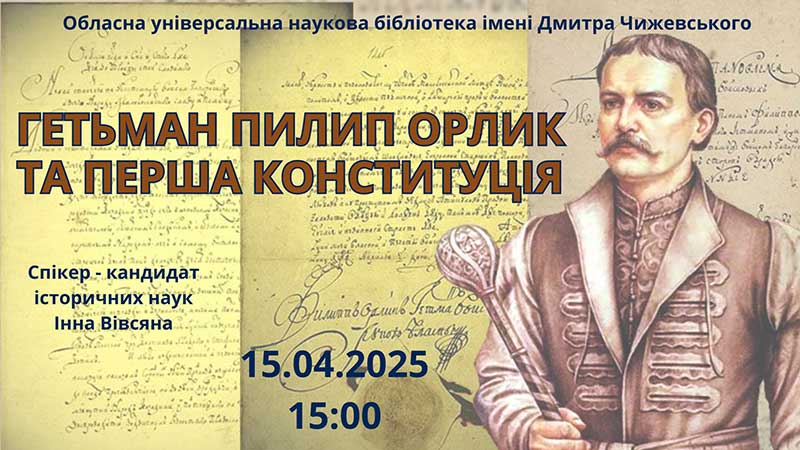 Запрошуємо на захід «Гетьман Пилип Орлик та перша конституція», присвячений видатному гетьману та його документу “Договори і Постановлення прав і вольностей Війська Запорозького”, укладеному 5 квітня 1710 року в місті Бендери між новообраним гетьманом Пилипом Орликом та козацькою старшиною.