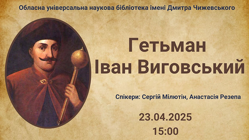 23 квітня о 15.00 у відділі обслуговування користувачів бібліотеки Чижевського відбудеться тематичний захід «Гетьман Іван Виговський», присвячений людині, яка стала символом боротьби за державність і незалежність України.