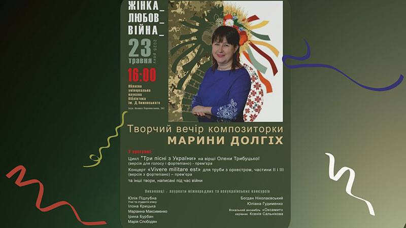 23 травня о 16:00 в актовій залі бібліотеки ім. Д. І. Чижевського відбудеться творчий вечір композиторки Марини Долгіх – подія, що поєднує глибоку емоцію, силу жіночого голосу і мистецтво, народжене під час війни.