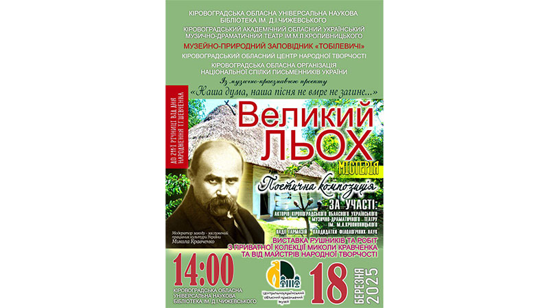 Вашій увазі буде представлена поетична композиція з поеми Тараса Шевченка «Великий льох» за участі акторів Кіровоградського академічного обласного українського музично-драматичного театру ім. М. Кропивницького.
