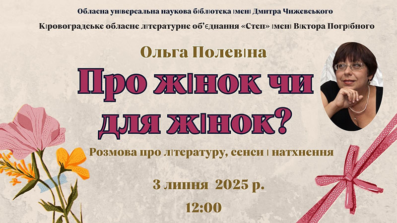 3 липня 2025 року о 12:00 у відділі краєзнавства бібліотеки Чижевського відбудеться зустріч з цікавою гостею – письменницею, головою обласного літературного об’єднання «Степ» імені Віктора Погрібного Ольгою Полевіною.