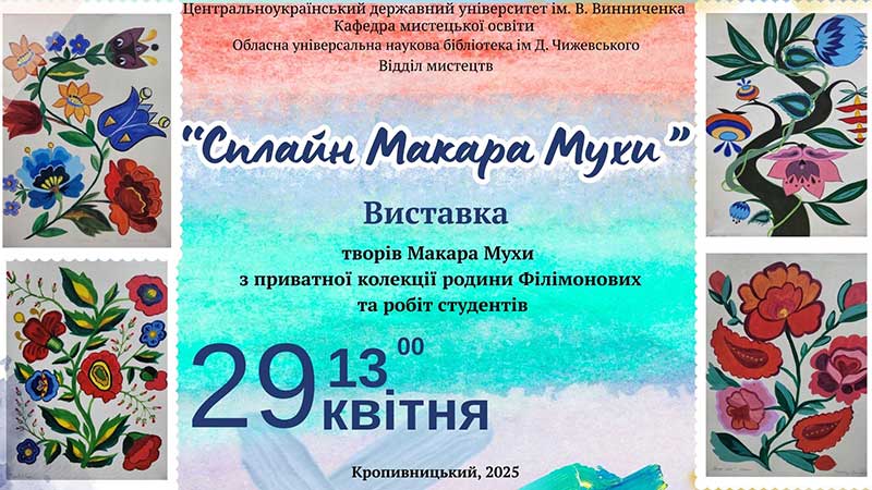Виставка – це мистецький діалог поколінь: поряд із роботами Макара Мухи – сміливі інтерпретації від студентів-декораторів кафедри мистецької освіти Центральноукраїнського держвного університету імені Володимира Винниченка. «Сплайн» як символ плавної лінії – між традицією та сучасністю, між рукою майстра і пензлем молодого митця.