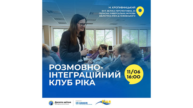 Вітаємо! Раді повідомити, що ГО «Десяте квітня» та Обласна універсальна наукова бібліотека ім. Д.І. Чижевського запрошують на засідання розмовно-інтеграційного клубу РІКА в м. Кропивницький.
