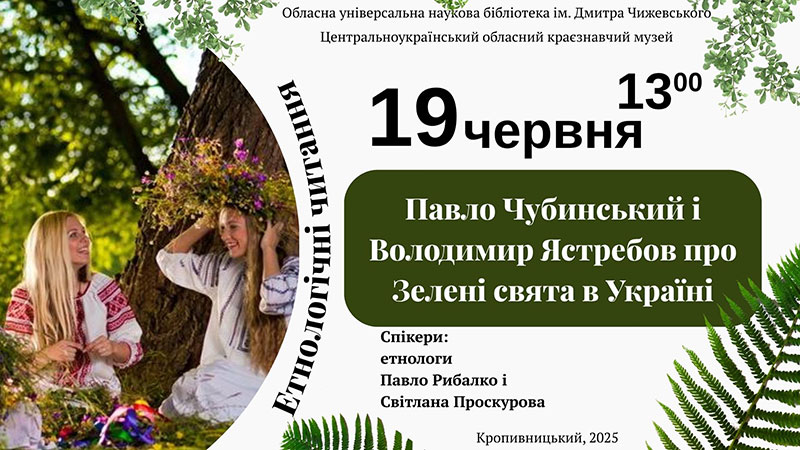 Запрошуємо всіх, хто цікавиться історією, культурою та українськими традиціями, на етнологічні читання «Павло Чубинський і Володимир Ястребов про Зелені свята в Україні».