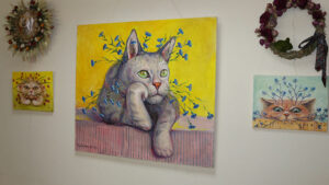 Так, коти! Великі й малі, пухнасті, задумливі, хитрі, здивовані, навіть трохи сердиті. Вони не намальовані – вони живі. У кожному портреті відчувається характер, емоція, особистість. Художниця олюднює образи тварин, і це виглядає напрочуд тепло й щиро. Можливо, саме тому так легко відчути радість, коли дивишся в ці хитрі чи мрійливі очі.