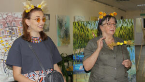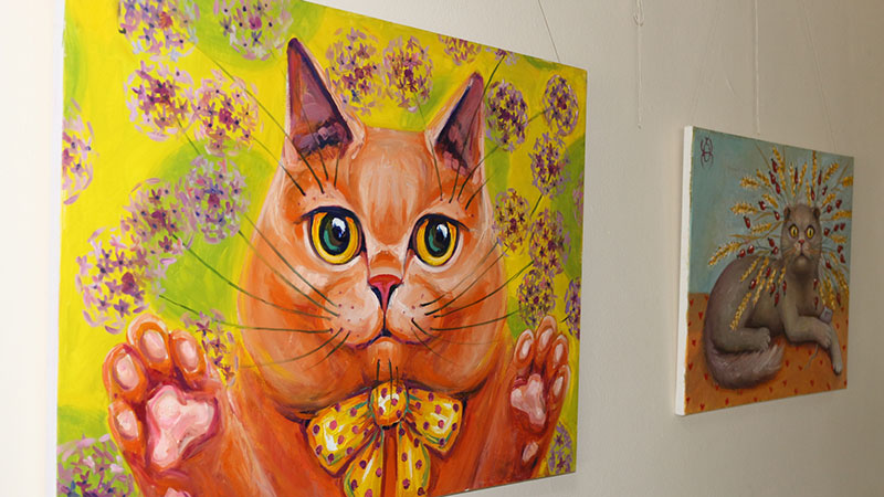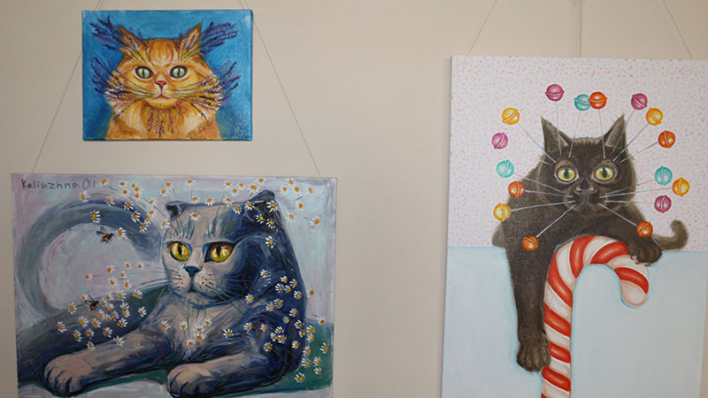 У холі бібліотеки Чижевського ви обов’язково зупинитесь. Тому що просто на вас дивитимуться десятки очей. А ви вдивлятиметесь в них. Це не фантасмагорія, а нова виставка молодої художниці з Кропивницького – Оксани Калюжної. І всі ці очі… котячі.