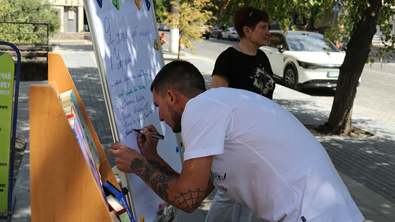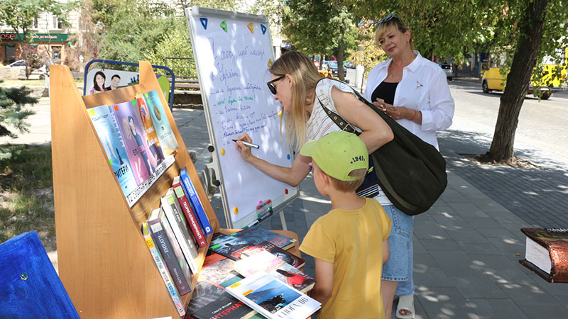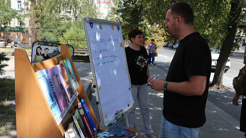 До уваги зацікавлених на виносній книжковій полиці були представлені видання молодих українських та зарубіжних письменників, а також книги, які найбільше привертають увагу молодих людей, серед них «Тригери» Маршалла Голдсміта, «Вимкни гаджет, увімкни життя» Мануша Зомороді, «Дівчина онлайн: соло» Зої Загг, «Ел і Ева» Наді Біли та інші видання.
