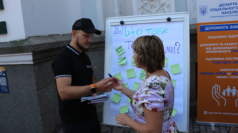 2025 року у Кропивницькому люди зібралися на інформаційно-просвітницьку вуличну акцію «Разом проти рабства: дій, допомагай, захищай!». В такий спосіб містяни приєднались до відзначення Всесвітнього дня протидії торгівлі людьми.
