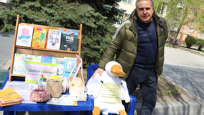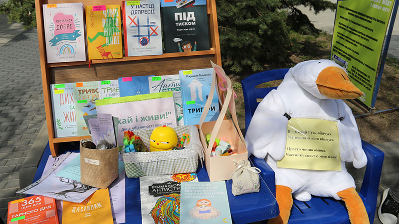 Особливу увагу привернув швидкий психологічний тест на перевірку рівня тривожності. А справжнім улюбленцем акції став великий м’який Гусь-обіймусь. Він викликав щирі усмішки як у дітей, так і у дорослих. Усі охочі могли обійняти іграшку або зробити фото. Також бібліотекарі пропонували іграшки-антистрес, розмальовки та корисні поради щодо подолання моральної чи фізичної напруги у повсякденному житті.