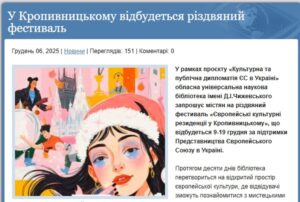 У рамках проєкту “Культурна та публічна дипломатія ЄС в Україні” обласна універсальна наукова бібліотека імені Д.І.Чижевського запрошує містян на різдвяний фестиваль «Європейські культурні резиденції у Кропивницькому», що відбудеться 9-19 грудня за підтримки Представництва Європейського Союзу в Україні.