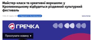 Майстер-класи та креативні воркшопи: у Кропивницькому відбудеться різдвяний культурний фестиваль // Гречка. – Режим доступу: https://gre4ka.info/anonsy/majster-klasy-ta-kreatyvni-vorkshopy-u-kropyvnyczkomu-vidbudetsya-rizdvyanyj-kulturnyj-festyval/. – Дата публікації: 06.12.2025.