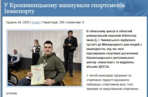 Сила духу та відзнака перемог: у Кропивницькому вшанували спортсменів Інваспорту за підсумками року // Кропивницька міська рада. – Режим доступу: https://kr-rada.gov.ua/news/sila-duhu-ta-vidznaka-peremog-u-kropivnitskomu-vshanuvali-sportsmeniv-invasportu-za-pidsumkami-roku_04-12-2025.html. – Дата публікації: 03.12.2025.