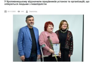 У Кропивницькому відзначили працівників установ та організацій, що опікуються людьми з інвалідністю // Кіровоград 24. – Режим доступу: https://kirovograd24.com/shortly/2025/12/03/u-kropivnitskomu-vidznachili-pratsivnikiv-ustanov-ta-organizatsii-scho-opikujutsja-ljudmi-z-invalidnistju.htm. – Дата публікації: 03.12.2025.
