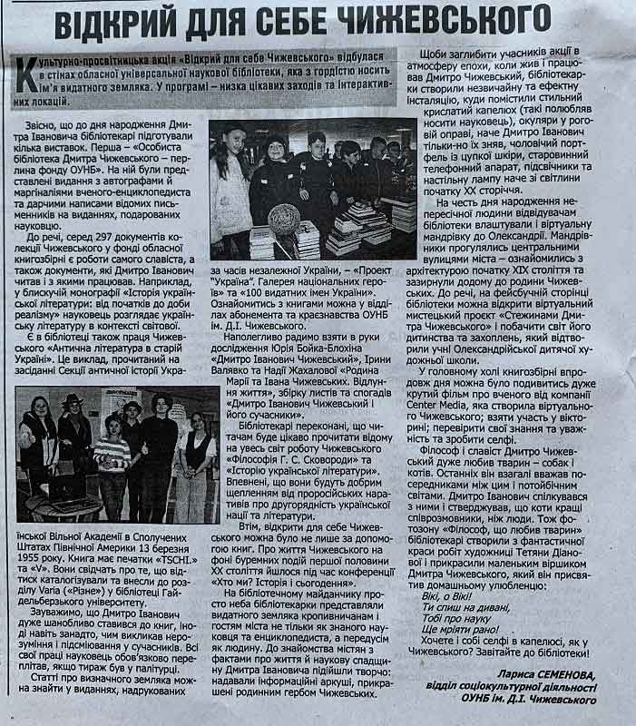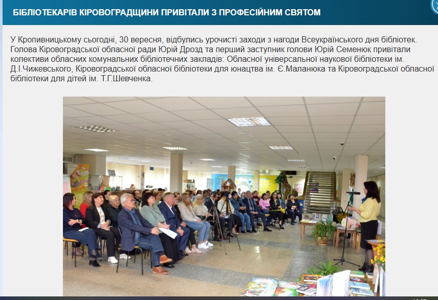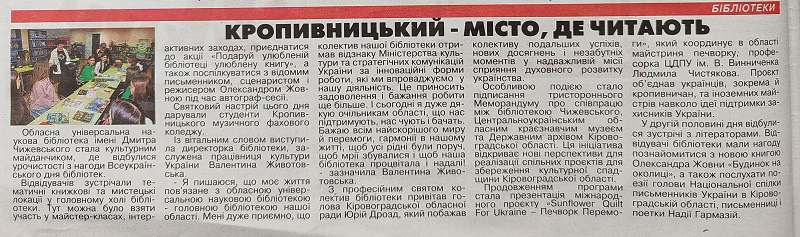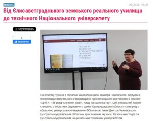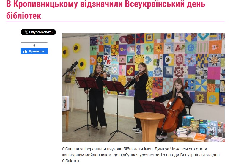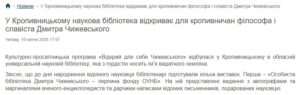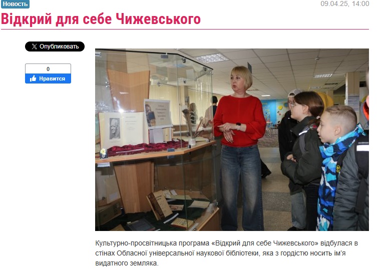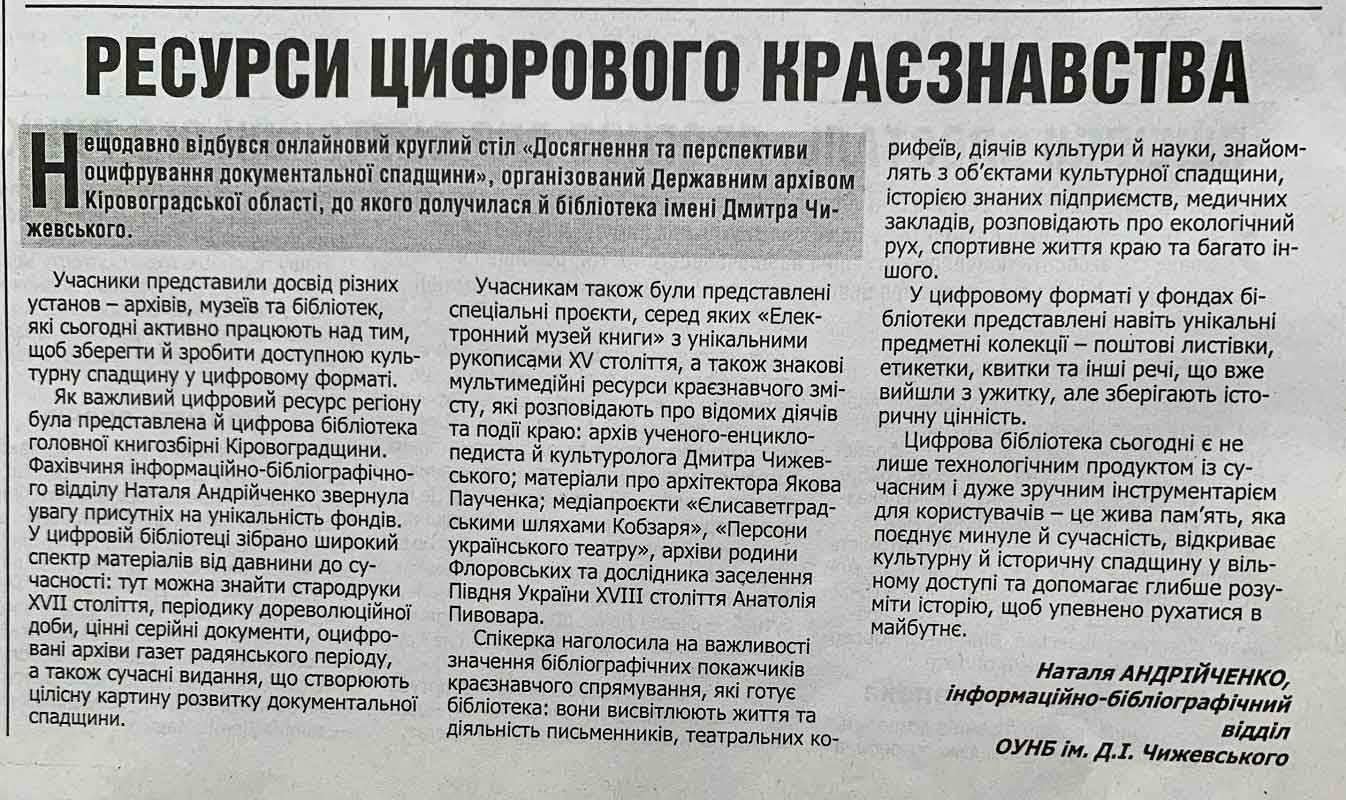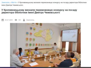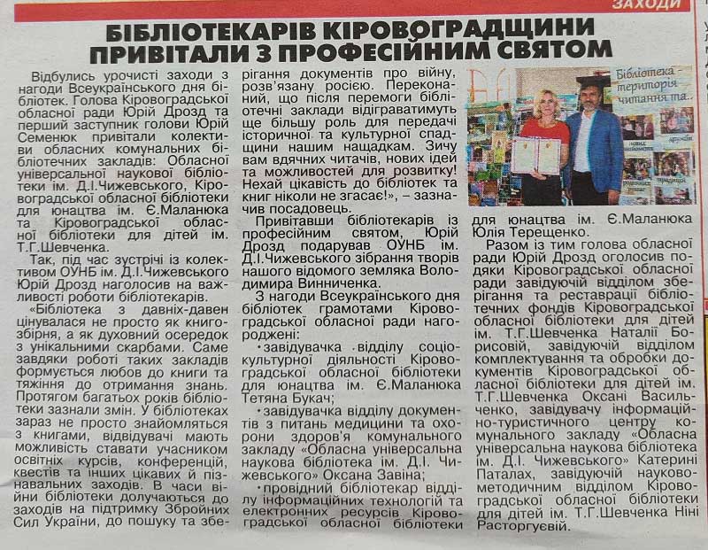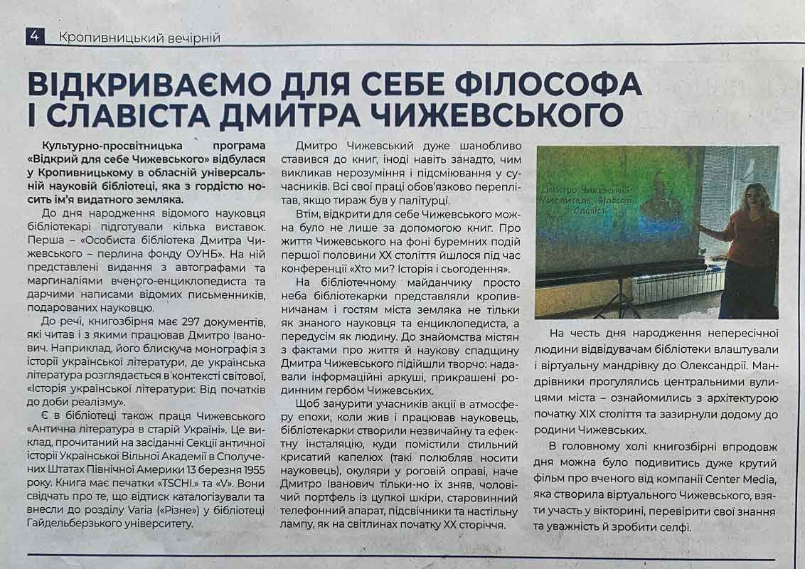 Обласна універсальна бібліотека ім.Д.Чижевського була обрана для грантового безоплатного отримання доступу до архіву української періодики онлайн Libraria // 21-й канал. – Режим доступу: https://21ch.kr.ua/posts/index/view/name/-1738838137. – Дата публікації: 06.02.2025.