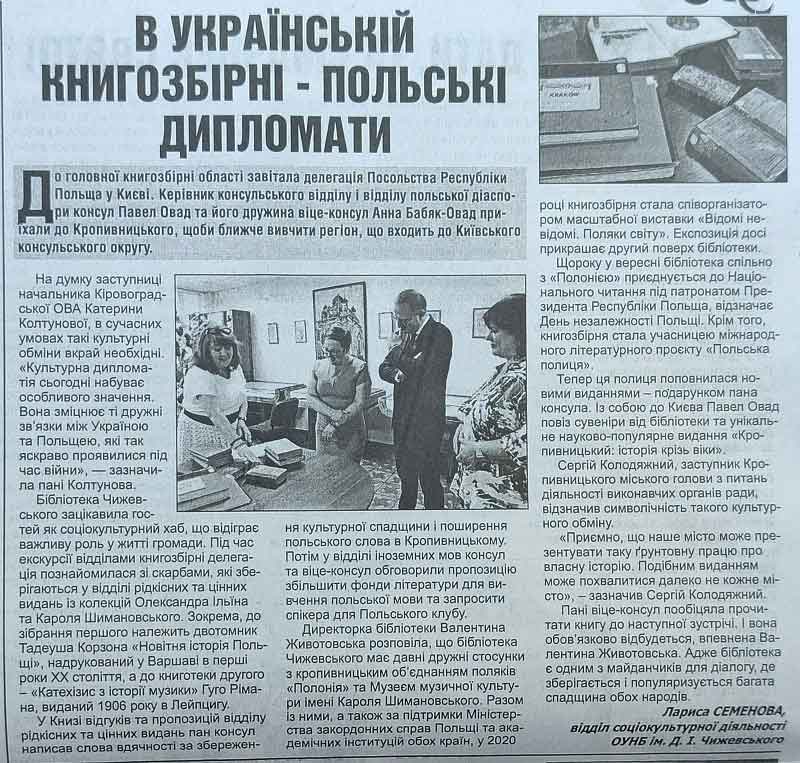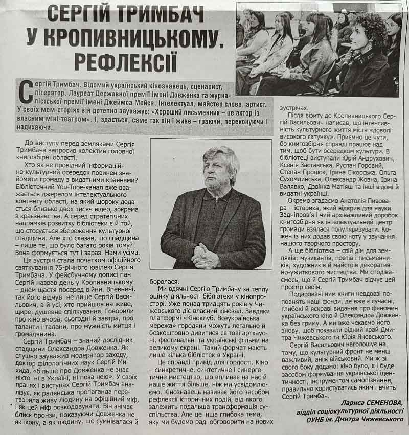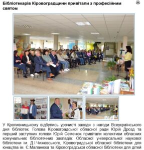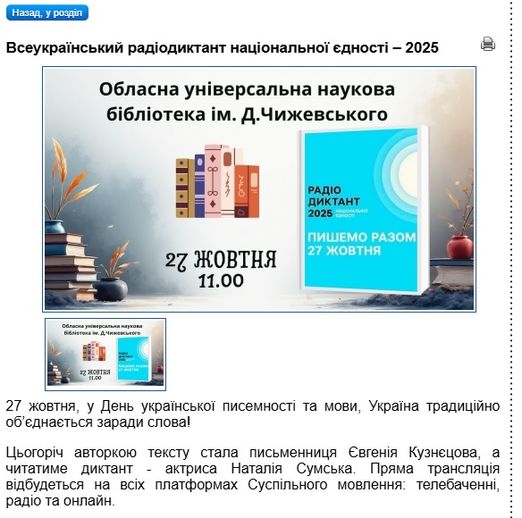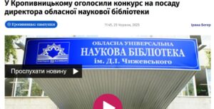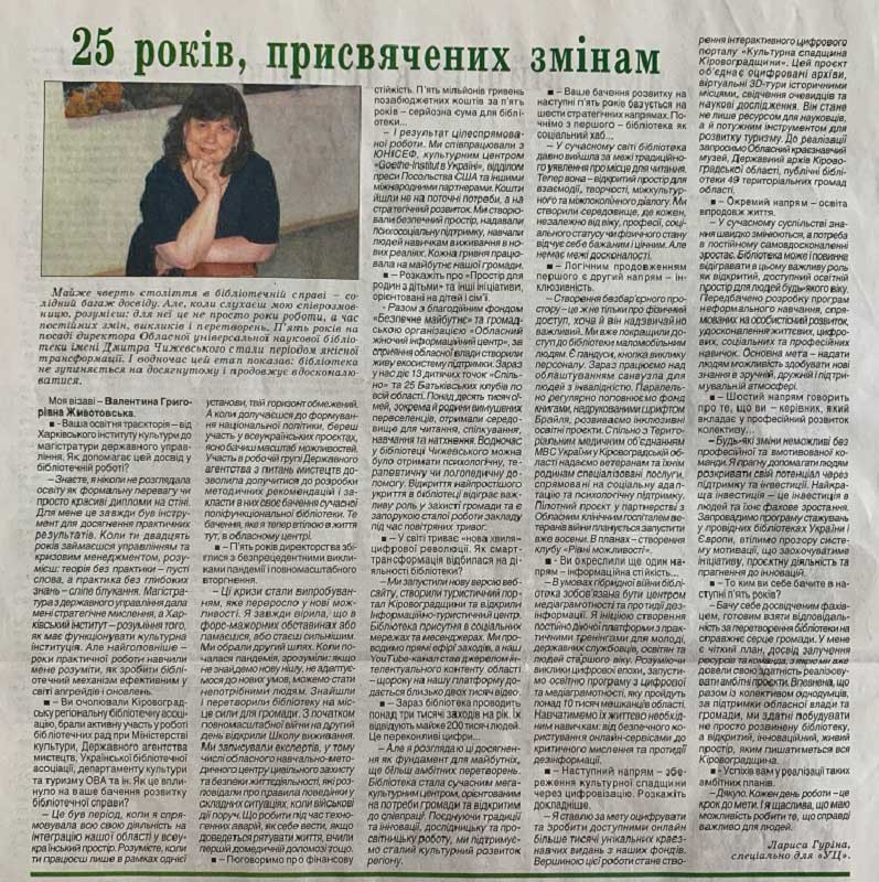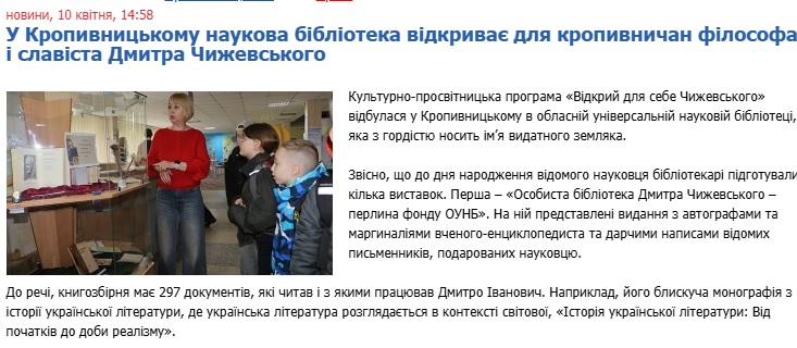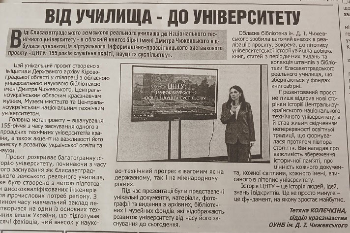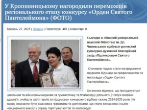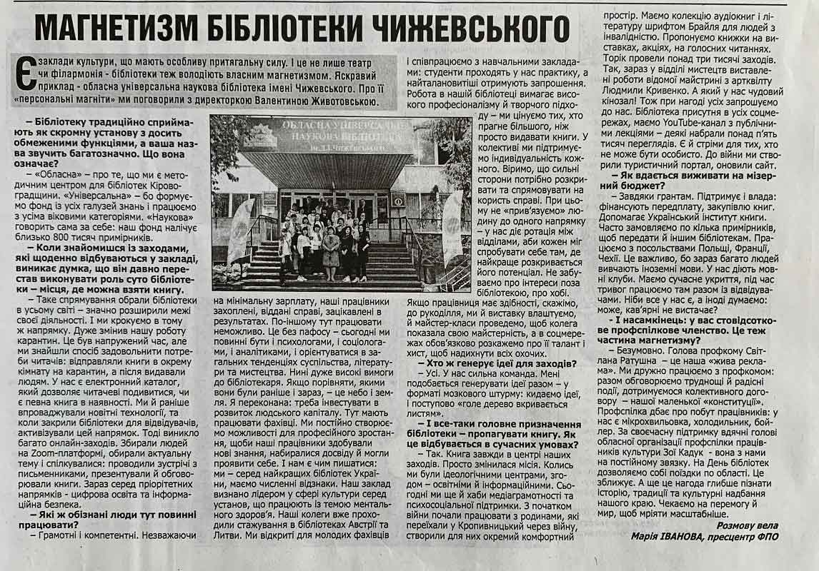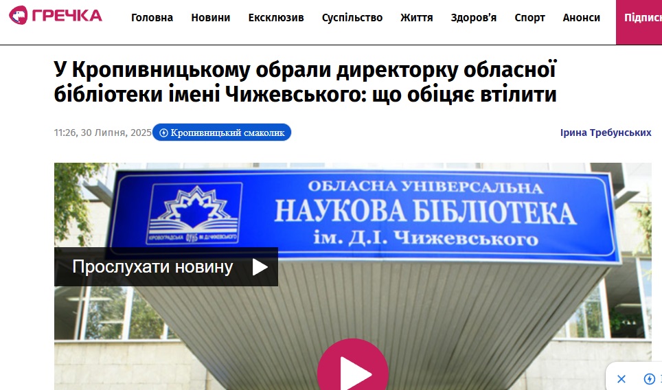 Обласна універсальна бібліотека ім.Д.Чижевського була обрана для грантового безоплатного отримання доступу до архіву української періодики онлайн Libraria // 21-й канал. – Режим доступу: https://21ch.kr.ua/posts/index/view/name/-1738838137. – Дата публікації: 06.02.2025.