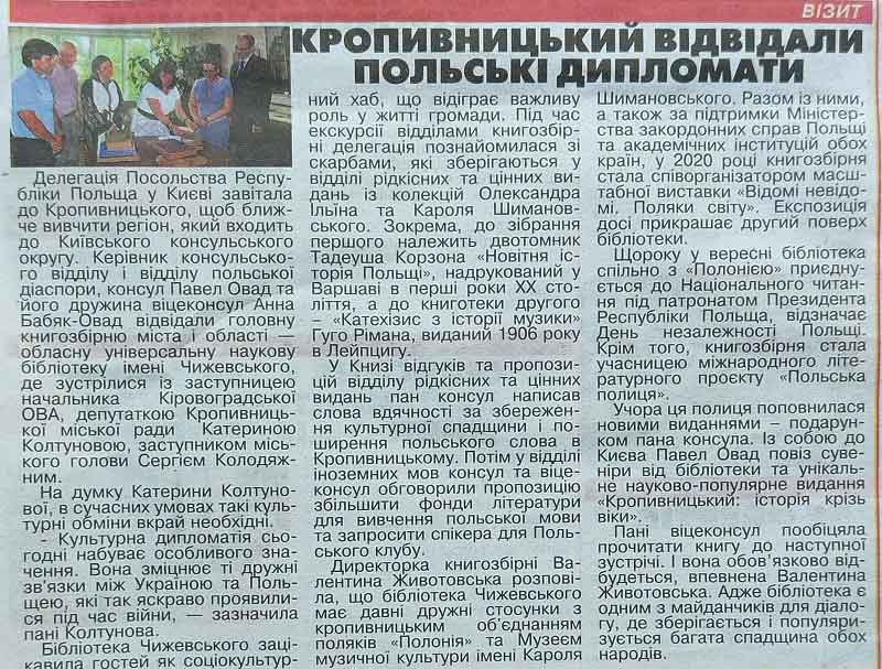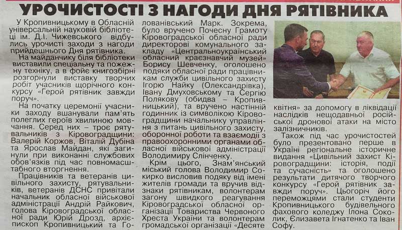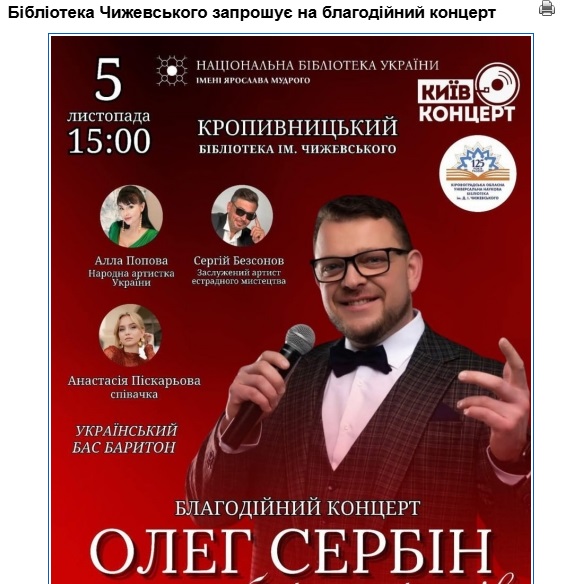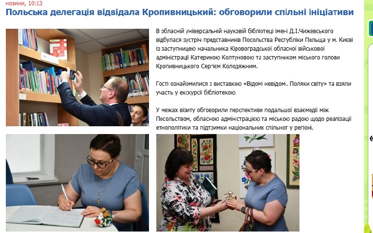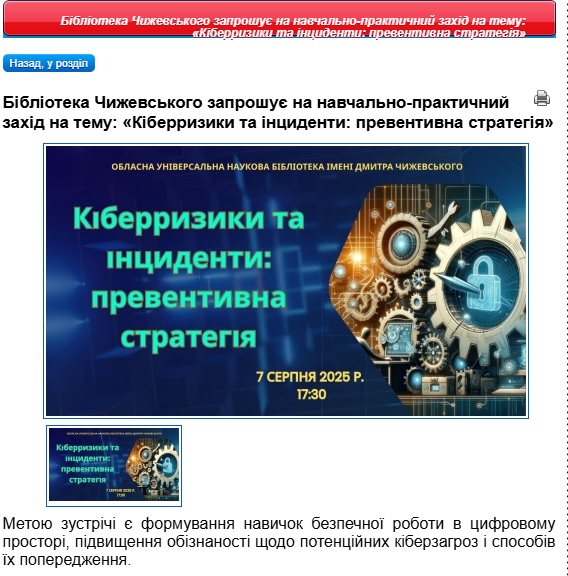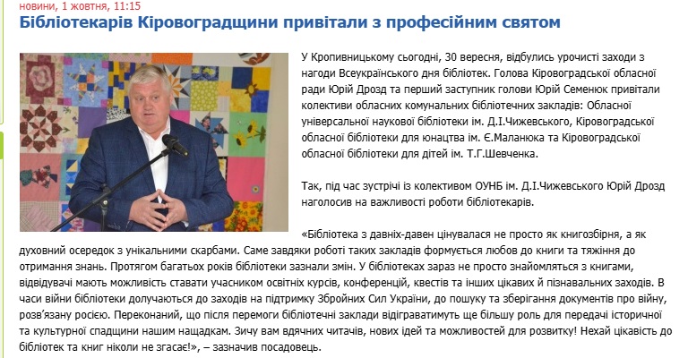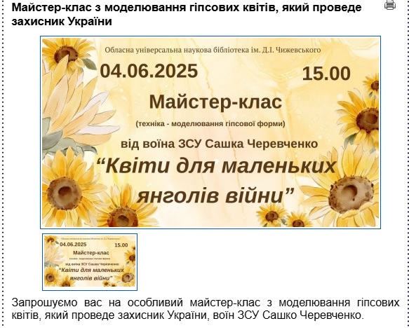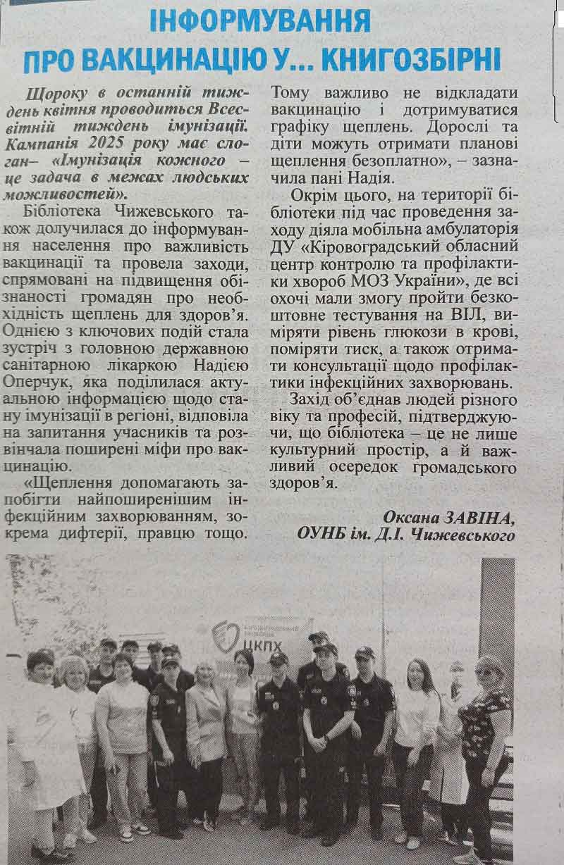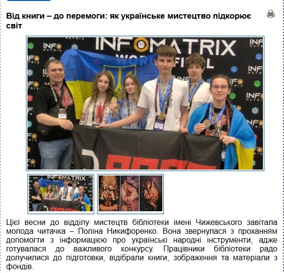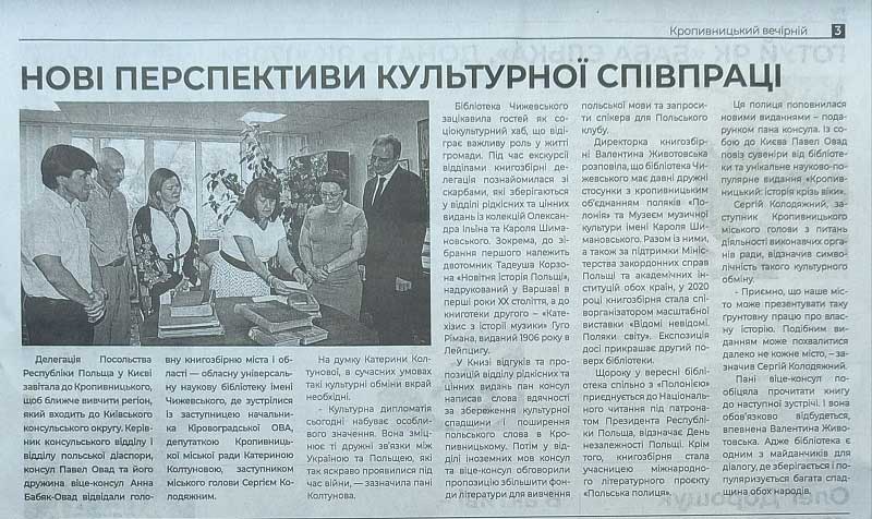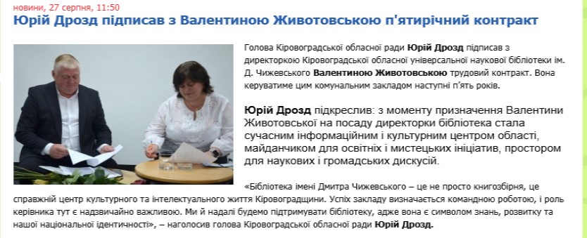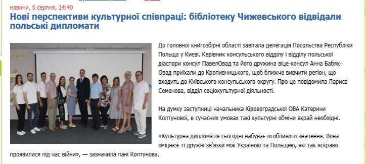 Обласна універсальна бібліотека ім.Д.Чижевського була обрана для грантового безоплатного отримання доступу до архіву української періодики онлайн Libraria // 21-й канал. – Режим доступу: https://21ch.kr.ua/posts/index/view/name/-1738838137. – Дата публікації: 06.02.2025.