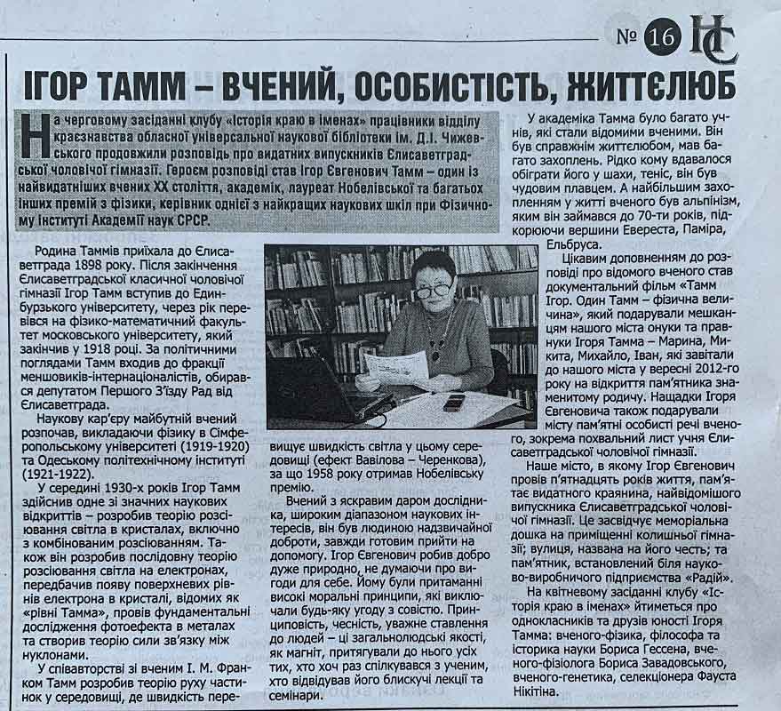 До Дня Соборності України у відділі краєзнавства ОУНБ ім. Д.І. Чижевського відбулася зустріч з автором видання «Соборницька місія Українських Січових Стрільців у Наддніпрянщині», кандидатом історичних наук Інною Вівсяною, яка розповіла про участь українських січових срільців у культурному житті громади під час їхнього перебування в Єлисаветграді.