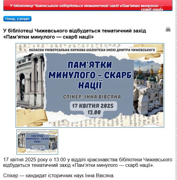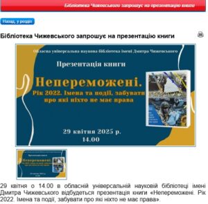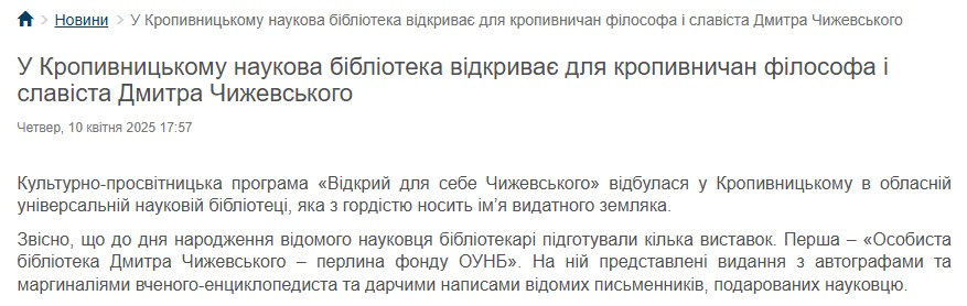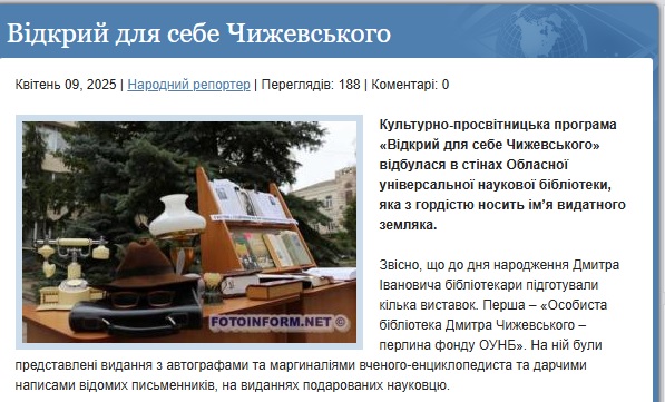 У Чижевського є безоплатний доступ до архіву української періодики онлайн LIBRARIA // 21-й канал. – 2025. – 13 лютого. – С. 5 : фото.кол.