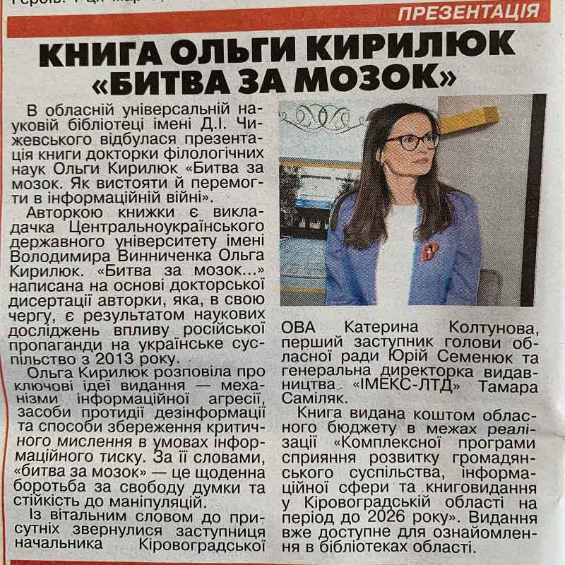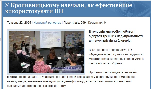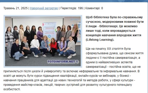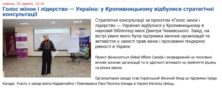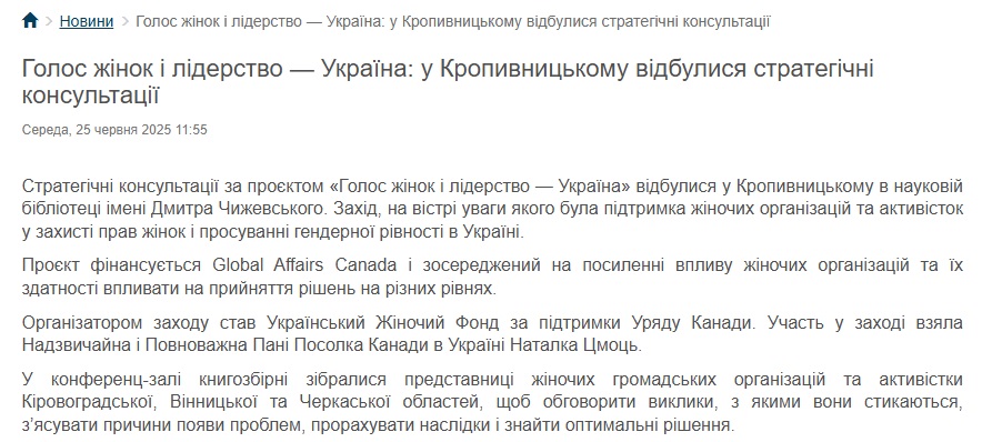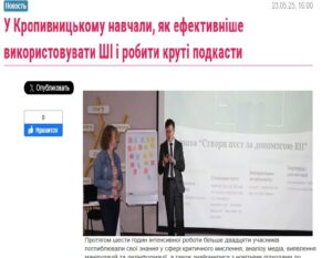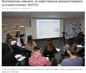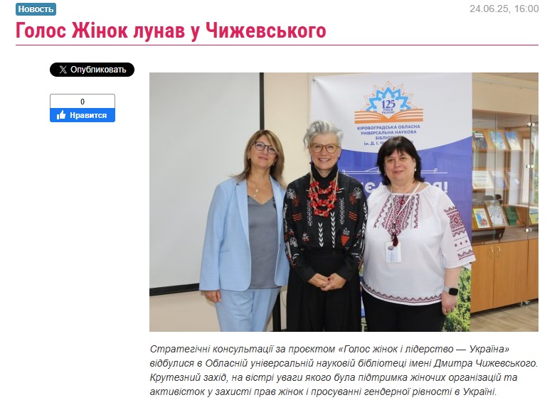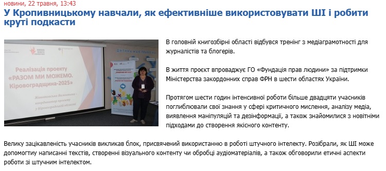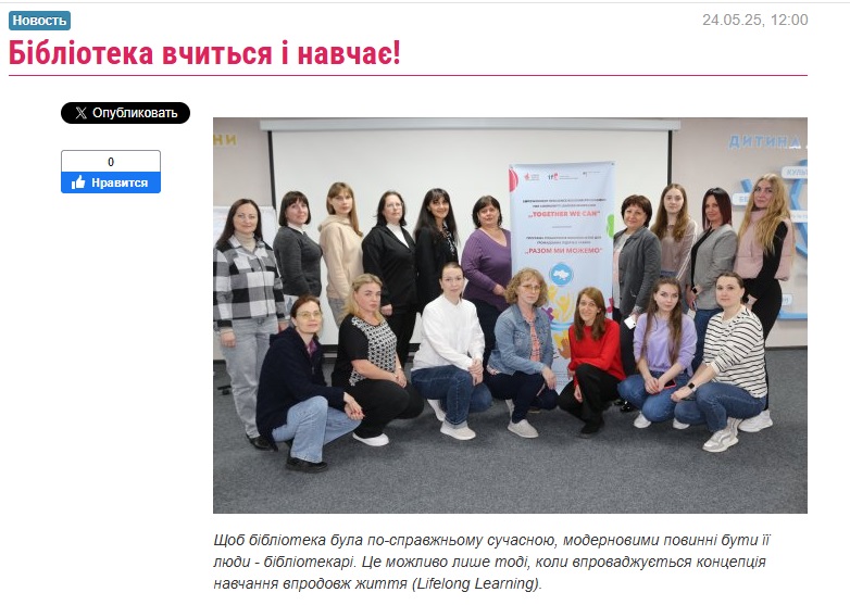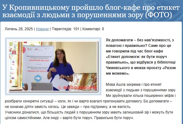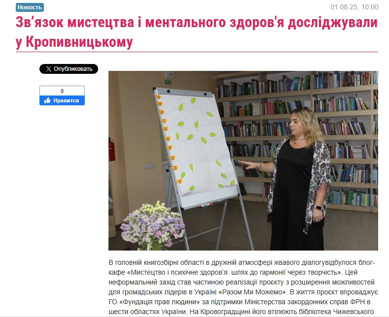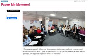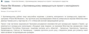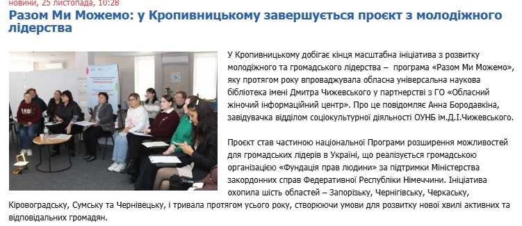 Разом Ми Можемо у Кропивницькому: у бібліотеці Чижевського стартує новий проєкт з молодіжного лідерства // Кіровоград 24. – Режим доступу: https://kirovograd24.com/shortly/2025/02/18/razom-mi-mozhemo-u-kropivnitskomu-u-bibliotetsi-chizhevskogo-startue-novii-proekt-z-molodizhnogo-liderstva.htm. – Дата публікації: 18.02.2025.