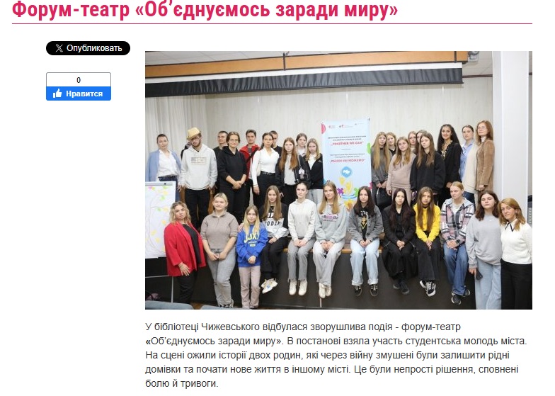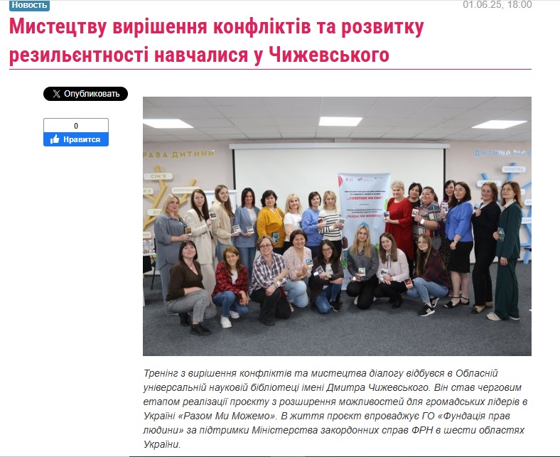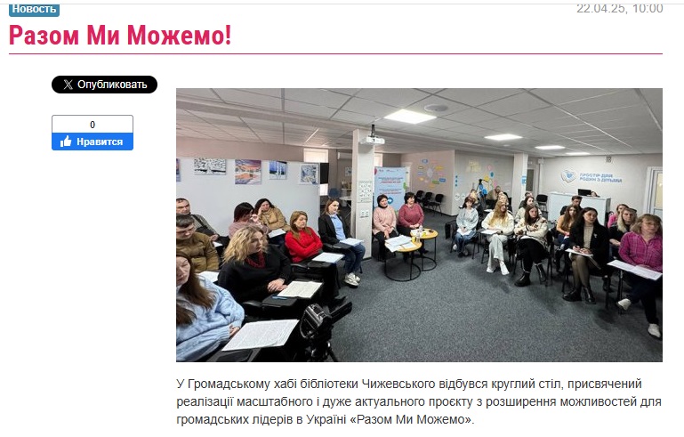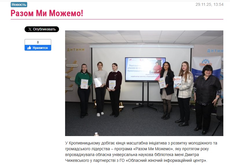 Разом Ми Можемо: у Кропивницькому у бібліотеці Чижевського стартує новий проєкт з молодіжного лідерства // Кропивницька міська рада. – Режим доступу: https://kr-rada.gov.ua/news/razom-mi-mozhemo-u-kropivnitskomu-u-bibliotetsi-chizhevskogo-startu-noviy-prokt-z-molodizhnogo-liderstva_18-02-2025.html. – Дата публікації: 18.02.2025.