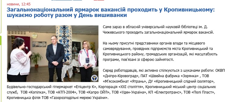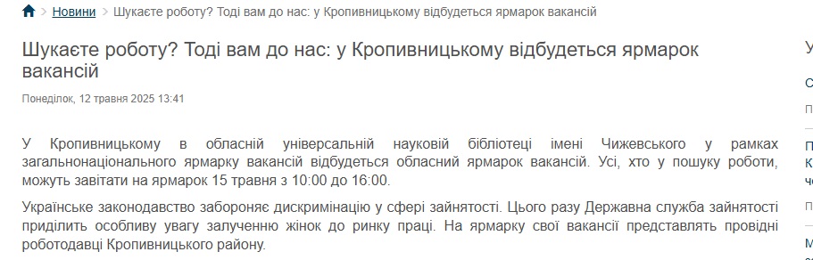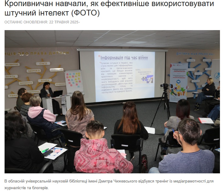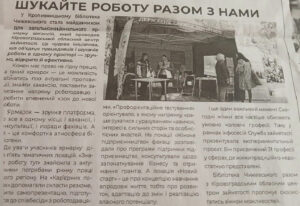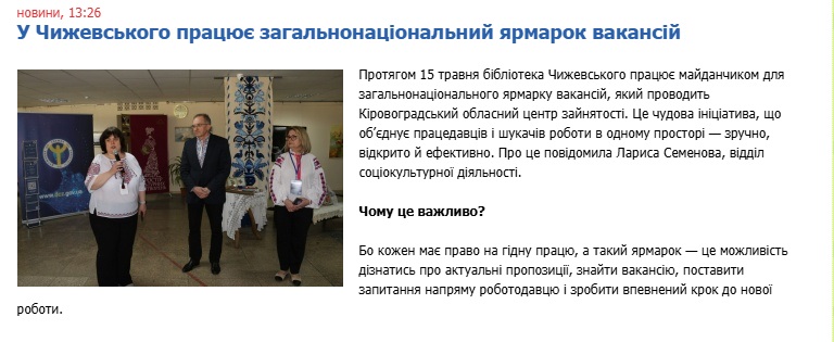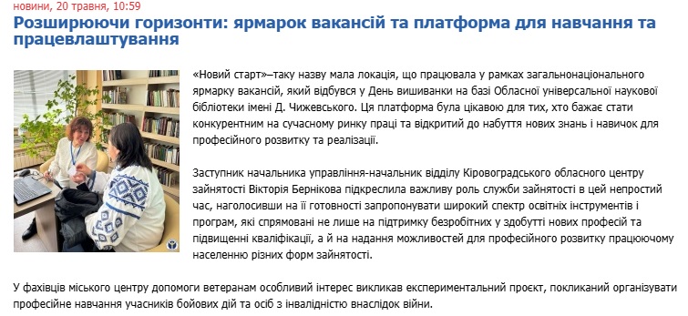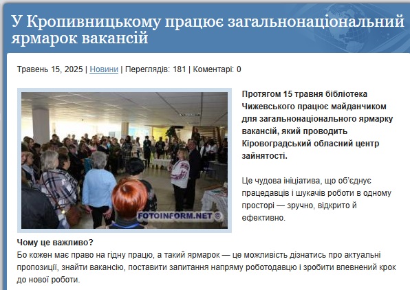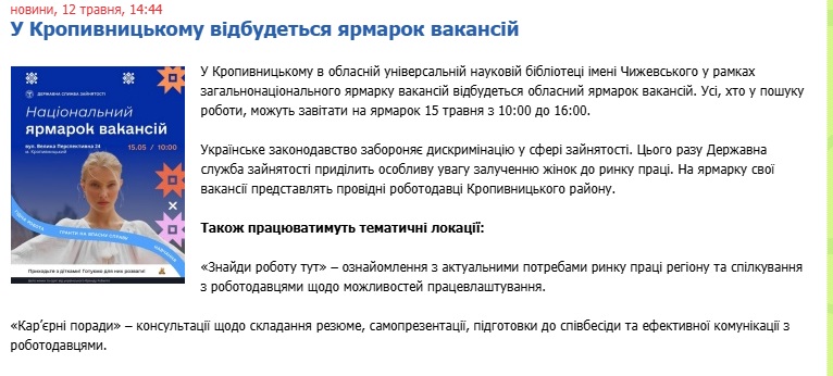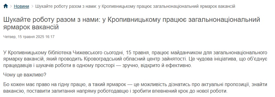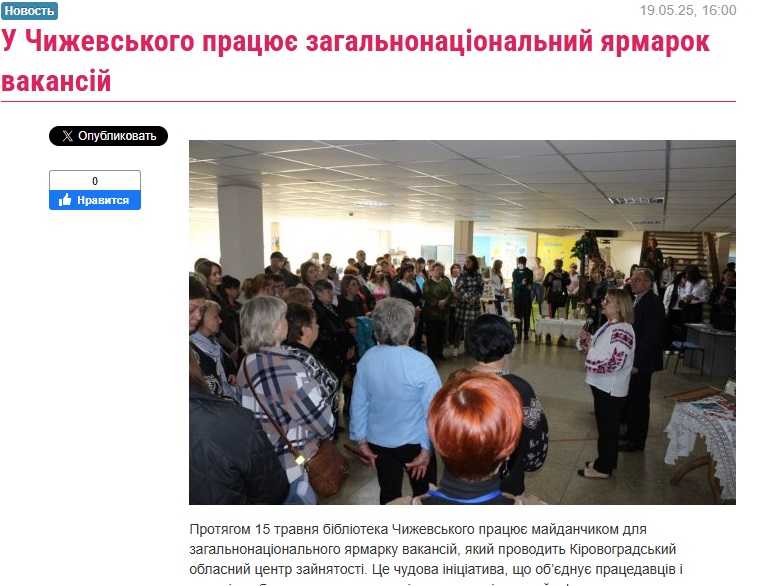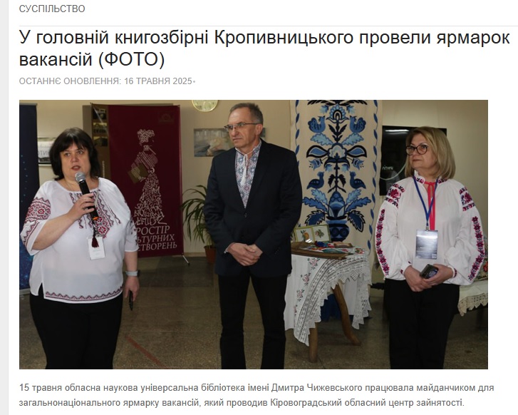 Трудові відносини без складнощів: важливий і потрібний проєкт в бібліотеці Чижевського // Кіровоградська обласна рада. – Режим доступу: https://oblrada.kr.ua/event/011020251051. – Дата публікації: 10.01.2025.