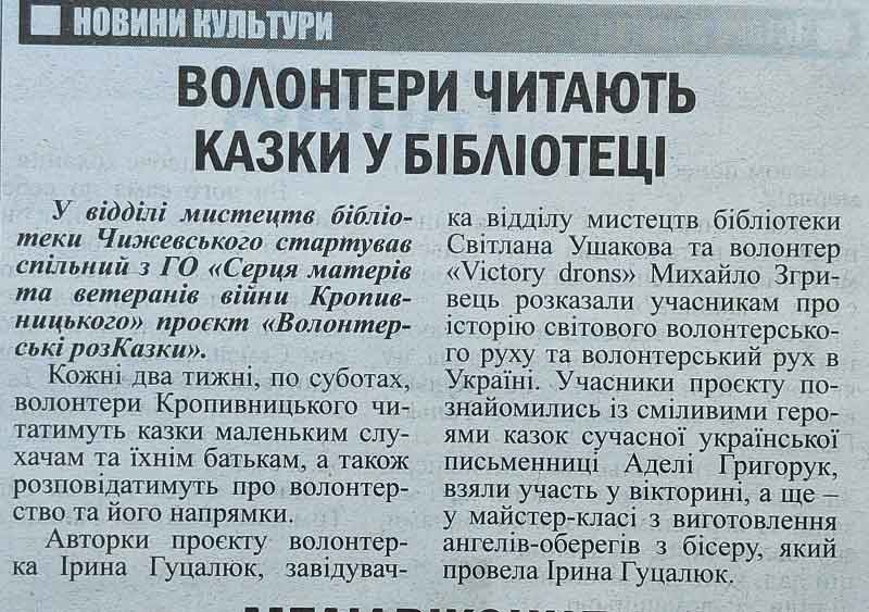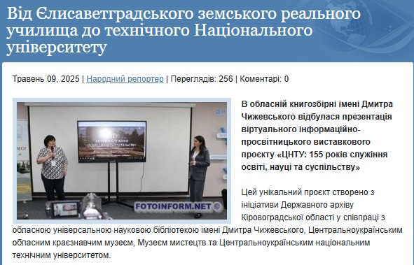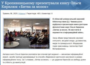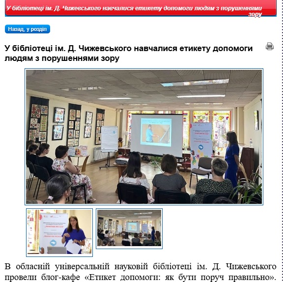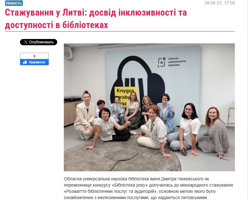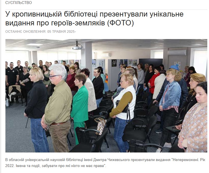 У Бібліотеці Чижевського стартує новий проєкт з молодіжного лідерства “Разом Ми Можемо” // Кіровоград 24. – Режим доступу: https://kirovograd24.com/shortly/2025/02/17/u-bibliotetsi-chizhevskogo-startue-novii-proekt-z-molodizhnogo-liderstva-razom-mi-mozhemo-.htm. – Дата публікації: 17.02.2025.