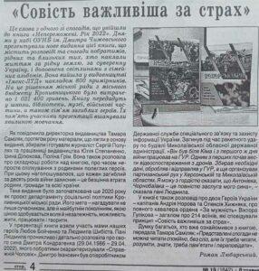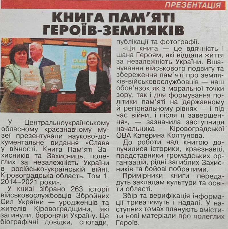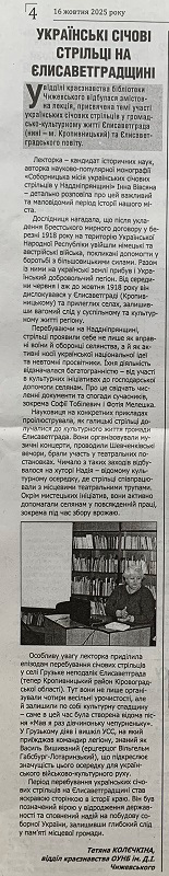 Колєчкіна Тетяна. Стрілецькі музи на Єлисаветградщині / Тетяна Колєчкіна // Народне слово. – 2025. – 6 лютого. – С. 5 : фото.