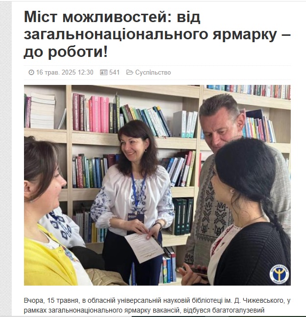 В Обласній універсальній науковій бібліотеці імені Дмитра Чижевського відбувся ярмарок вакансій для ветеранів «Нові можливості після служби». Захід об’єднав ветеранські бізнеси, роботодавців, навчальні заклади, державні і громадські установи, Захисників та Захисниць.