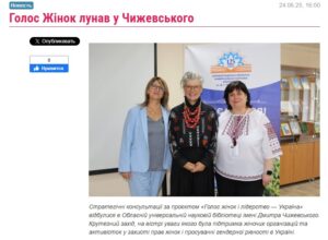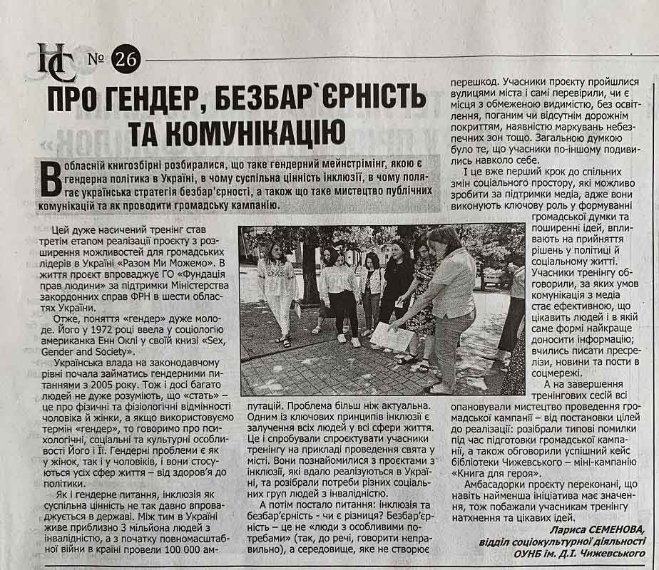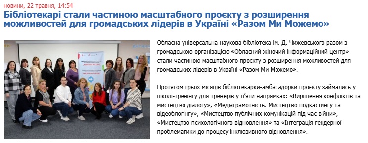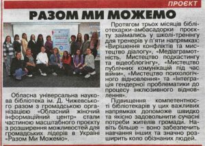 Про проєкт, що став частиною національної Програми з розвитку молодіжного та громадського лідерства «Разом Ми Можемо», який протягом року впроваджувала Обласна наукова бібліотека імені Дмитра Чижевського у партнерстві з ГО «Обласний жіночий інформаційний центр».