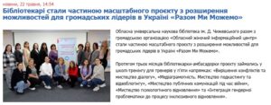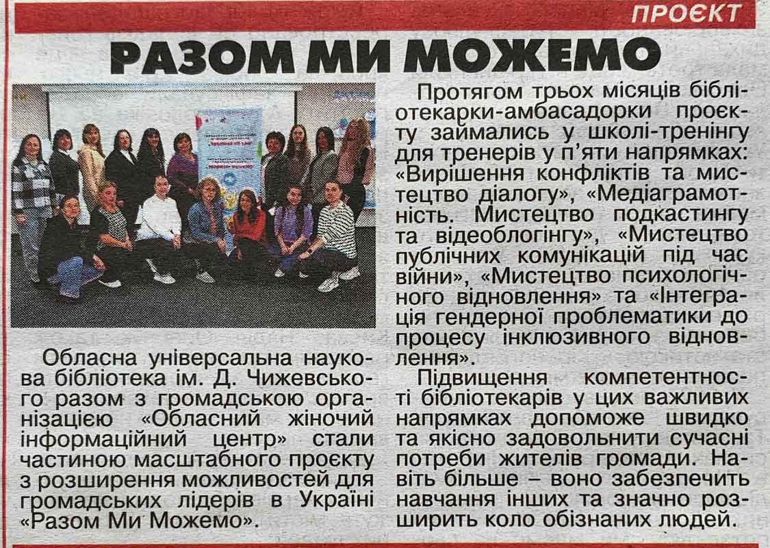 У Кропивницькому універсальна наукова бібліотека імені Дмитра Чижевського у партнерстві з ГО «Обласний жіночий інформаційний центр» впроваджують новий проєкту – Програму розширення можливостей для громадських лідерів в Україні “Разом Ми Можемо”.