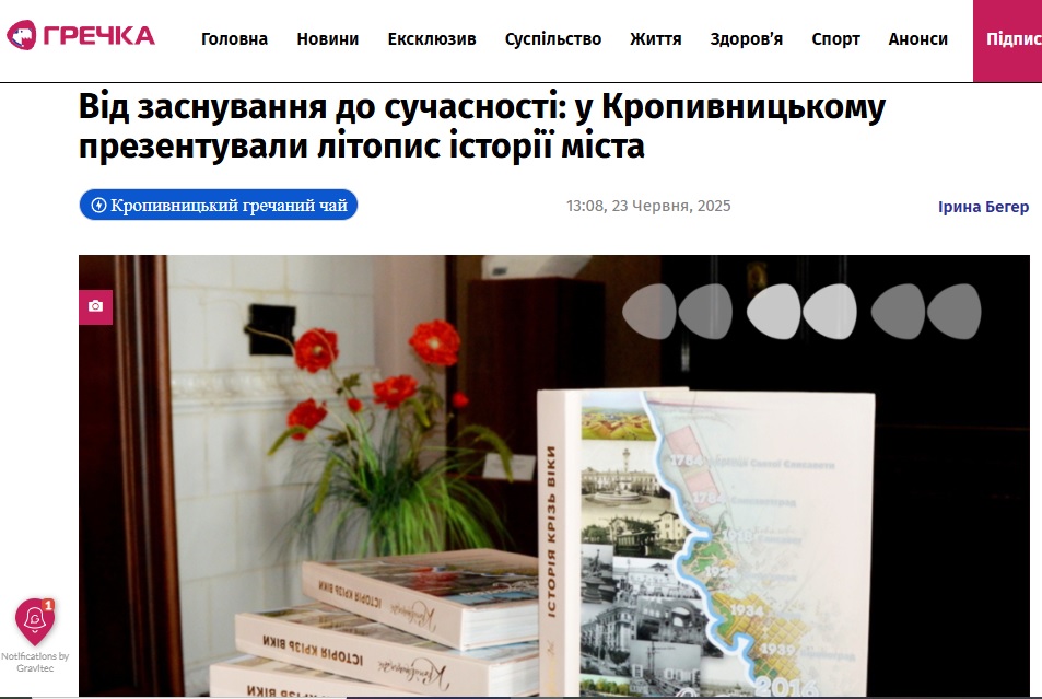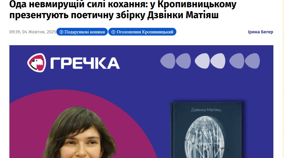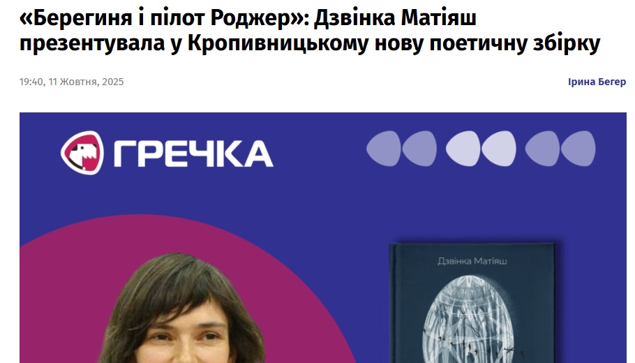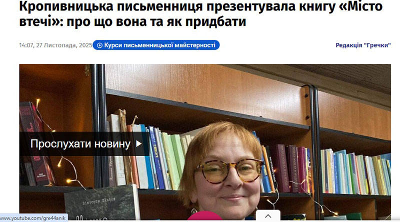 Кропивницька письменниця презентувала книгу «Місто втечі»: про що вона та як придбати // Гречка. – Режим доступу: https://gre4ka.info/suspilstvo/kropyvnyczka-pysmennyczya-prezentuvala-knygu-misto-vtechi-pro-shho-vona-ta-yak-prydbaty/. – Дата публікації: 27.11.2025.