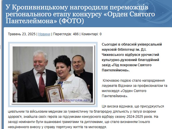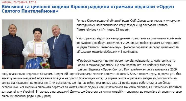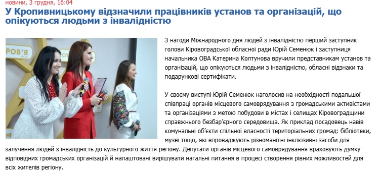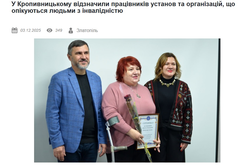 У Кропивницькому відзначили працівників установ та організацій, що опікуються людьми з інвалідністю // Златопіль. – Режим доступу: https://zlatopil.com/all-news/u-kropyvnytskomu-vidznachyly-pratsivnykiv-ustanov-ta-organizatsij-shho-opikuyutsya-lyudmy-z-invalidnistyu. – Дата публікації: 03.12.2025.