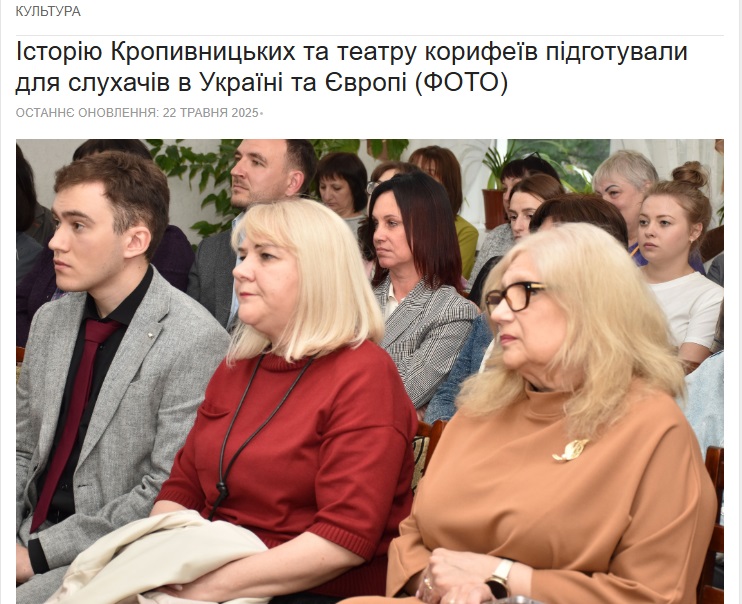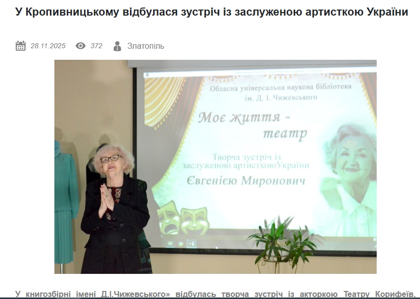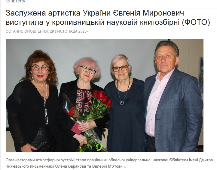 Заслужена артистка України Євгенія Миронович виступила у кропивницькій науковій книгозбірні (ФОТО) // З перших уст. – Режим доступу: https://zpu.kr.ua/kultura/35154-zasluzhena-artystka-ukrainy-yevheniia-myronovych-vystupyla-u-kropyvnytskii-naukovii-knyhozbirni-foto. – Дата публікації: 29.11.2025.