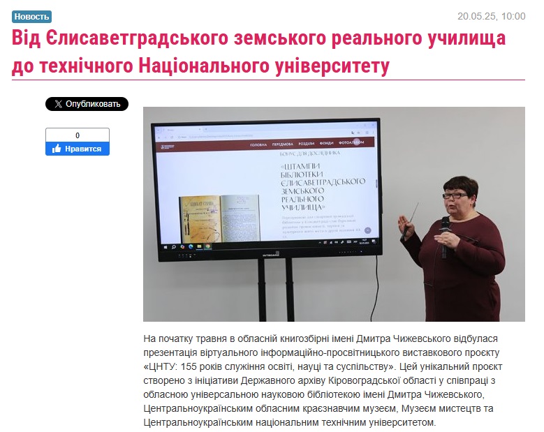 Презентація віртуальних медіапроєктів «Жінки в науці: галерея історичних портретів» та «Невже це все зробили жінки?» // 21-й канал. – Режим доступу: https://21ch.kr.ua/posts/index/view/name/prezentatsija-virtualnih-mediaprojektiv-1739188083. – Дата публікації: 10.02.2025.