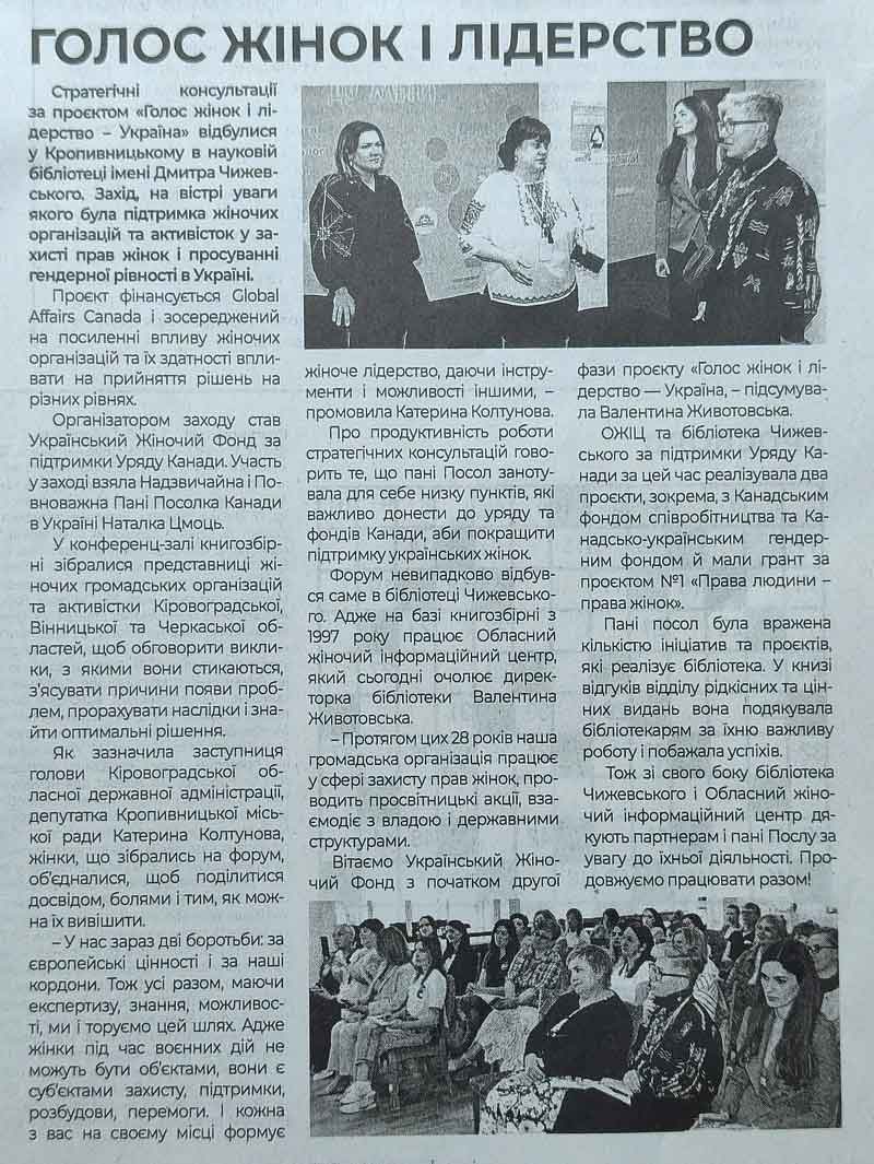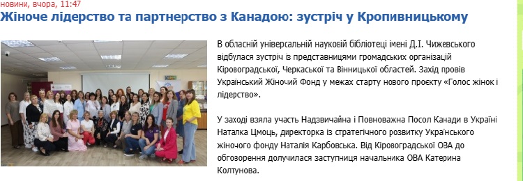 У Кропивницькому універсальна наукова бібліотека імені Дмитра Чижевського у партнерстві з ГО «Обласний жіночий інформаційний центр» впроваджують новий проєкт – Програму розширення можливостей для громадських лідерів в Україні “Разом Ми Можемо”.
