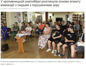 В ОУНБ ім. Д.І. Чижевського відбулася зустріч «Жива книга», організована Міжнародною благодійною організацією «Партнерство «Кожній дитині» у співпраці з Кіровоградською обласною військовою адміністрацією. На заході патронатні вихователі та вихователі інших сімейних форм виховання розповіли як підтримати дітей у кризові моменти й створити безпечне середовище для їхнього розвитку.