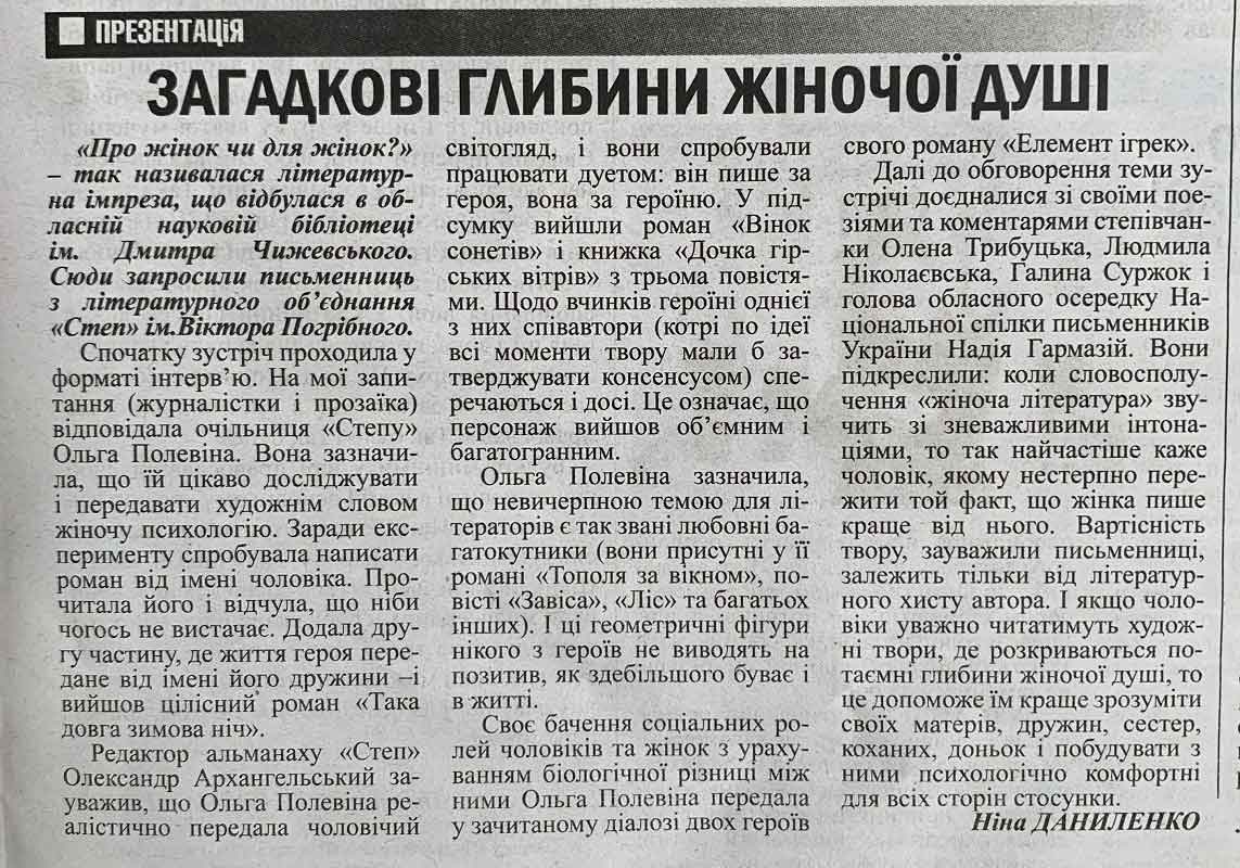 Даниленко Ніна. 85-річчя обласного літоб’єднання «Степ» / Ніна Даниленко // 21-й канал. – 2025. – 23 січня. – С. 6 : фото.кол.