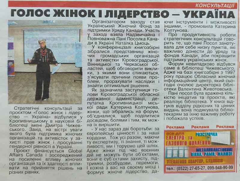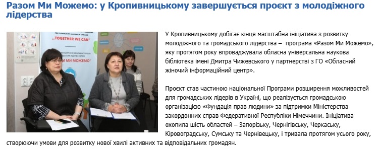 Обласна універсальна наукова бібліотека ім. Д.І. Чижевського у партнерстві з ГО «Обласний жіночий інформаційний центр» стали регіональним представником в Кіровоградській області з впровадження в Україні нового проєкту – Програми розширення можливостей для громадських лідерів в Україні “Разом Ми Можемо”, який реалізується громадською організацією „Фундація прав людини” за підтримки Міністерства закордонних справ Федеративної Республіки Німеччини.