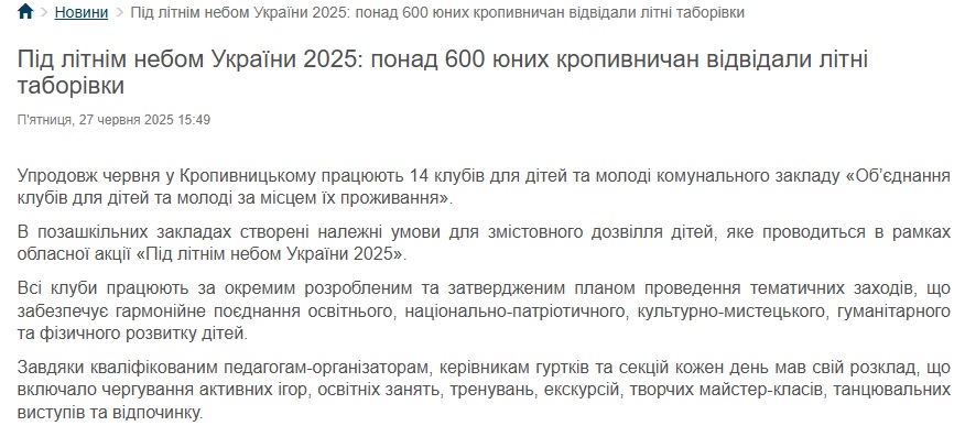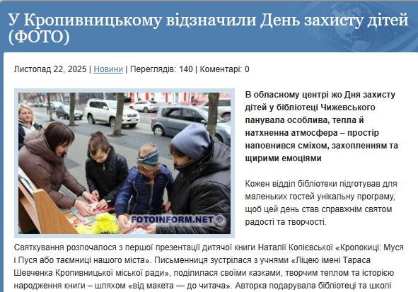 У Кропивницькому відзначили День захисту дітей (ФОТО) // Фотоінформ. – Режим доступу: https://www.fotoinform.net/news/novosti-na-ukrainskom-yazike/u-kropivnitskomu-vidznachili-den-zahistu-ditey-foto.html. – Дата публікації: 22.11.2025.