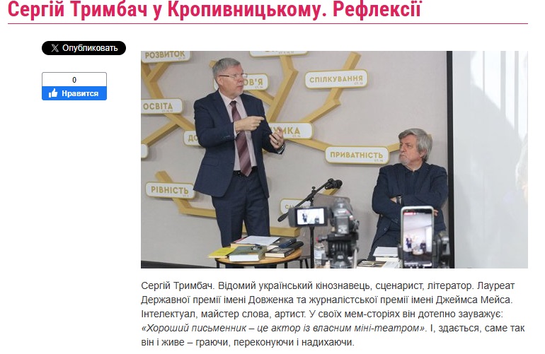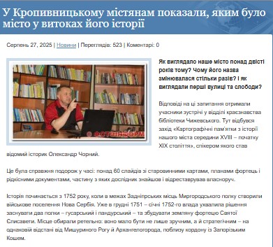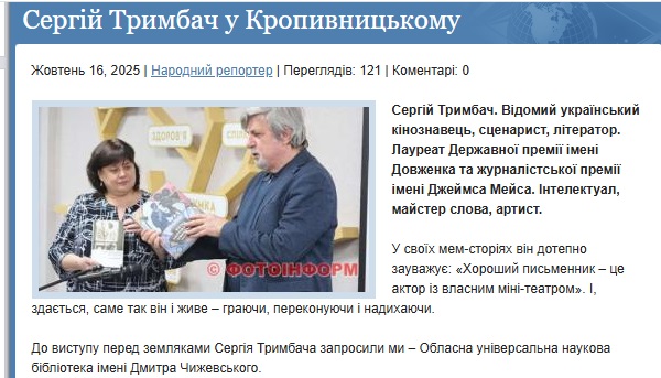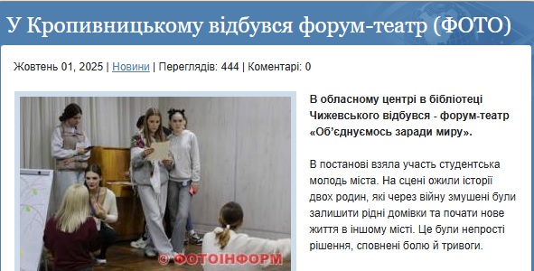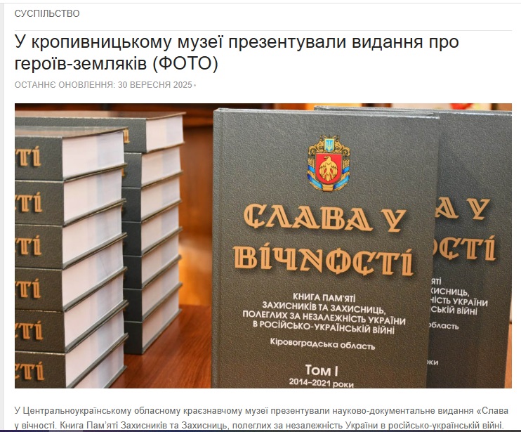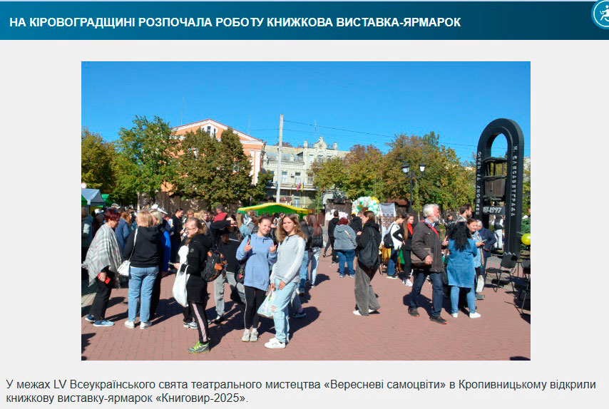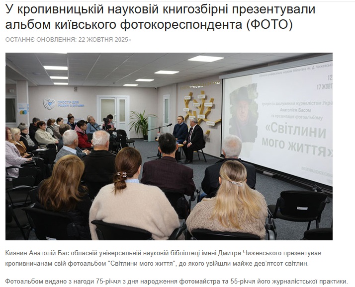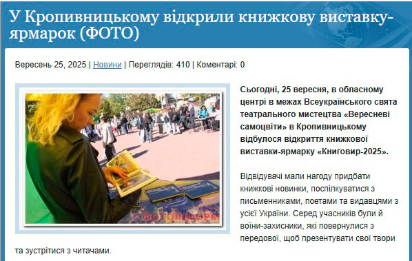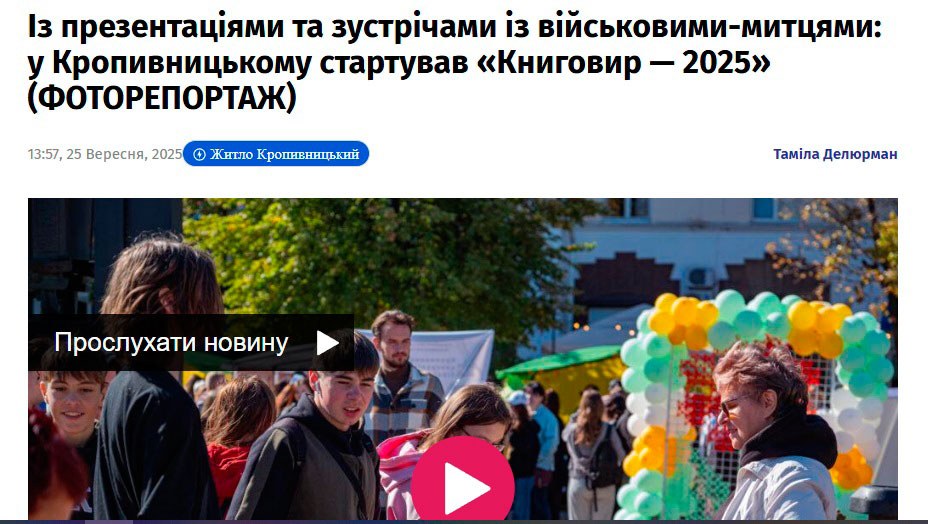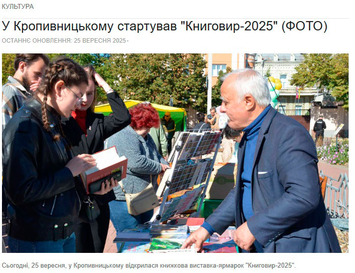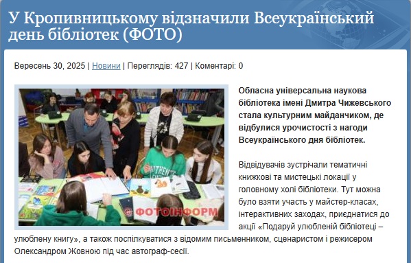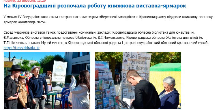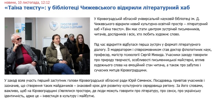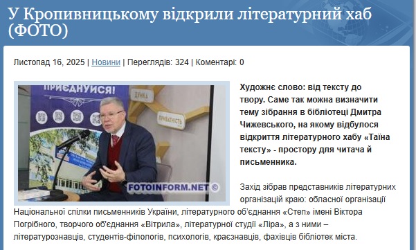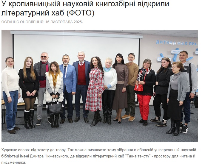 У Кропивницькому відкрили літературний хаб (ФОТО) // Фотоінформ. – Режим доступу: https://www.fotoinform.net/news/novosti-na-ukrainskom-yazike/u-kropivniitskomu-vidkrili-literaturniy-hab-foto.html. –Дата публікації: 16.11.2025.