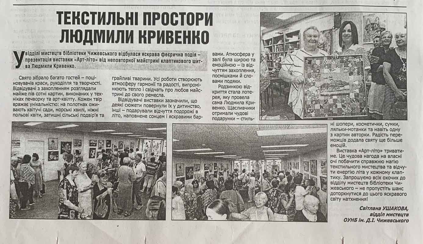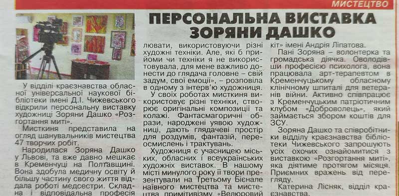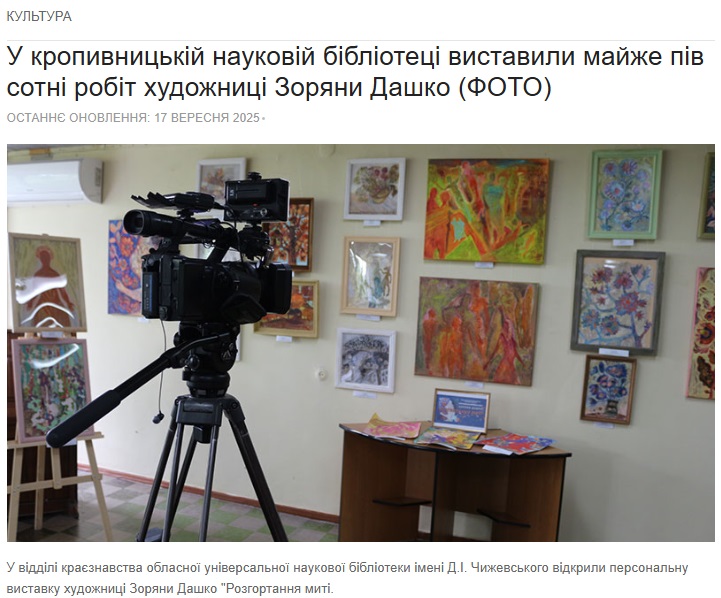 У бібліотеці Чижевського експонується виставка живопису // 21-й канал. – Режим доступу: https://21ch.kr.ua/posts/index/view/name/u-bibliotetsi-chizhevskogo-eksponujetsja-vistavka-zhivopisu-1736240386. – Дата публікації: 07.01.2025.