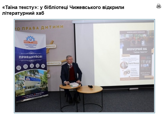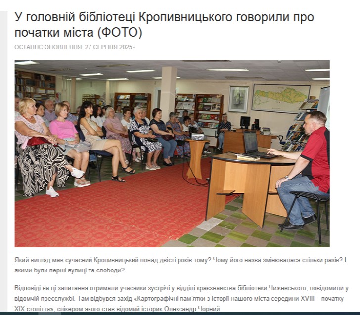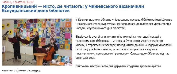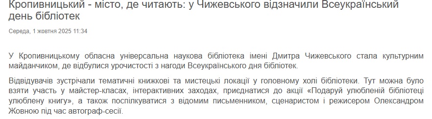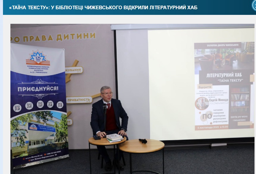 У кропивницькій науковій книгозбірні відкрили літературний хаб (ФОТО) // З перших уст. – Режим доступу: https://zpu.kr.ua/kultura/35080-u-kropyvnytskii-naukovii-knyhozbirni-vidkryly-literaturnyi-khab-foto. – Дата публікації: 16.11.2025.