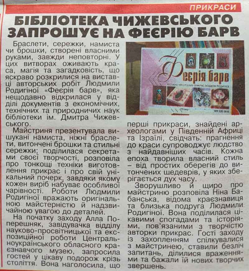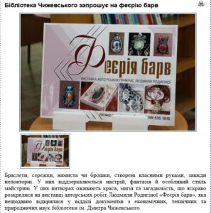 У відділі документів з економічних, технічних та природничих наук Обласної універсальної наукової бібліотеки ім. Д.І. Чижевського відкрилась виставка робіт декоративно-прикладного мистецтва медичних працівниць Кропивницького «Творчість нас рятує». Експозиція яскраво демонструє, що медикині можуть бути не тільки фахівцями своєї справи, а ще й творчими людьми.