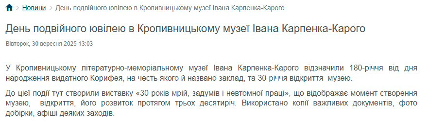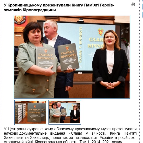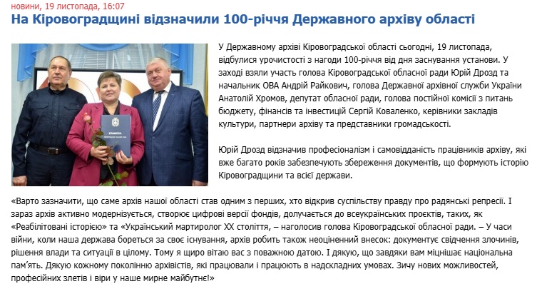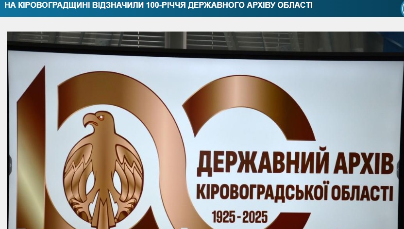 На Кіровоградщині відзначили 100-річчя Державного архіву області // Кіровоград 24. – Режим доступу: https://kirovograd24.com/shortly/2025/11/19/na-kirovogradschini-vidznachili-100-richchja-derzhavnogo-arhivu-oblasti.htm. – Дата публікації: 19.11.2025.