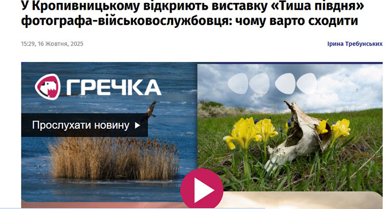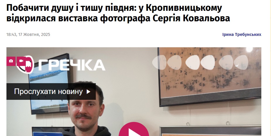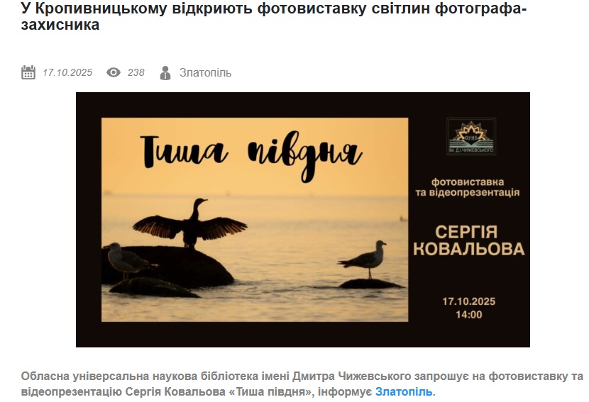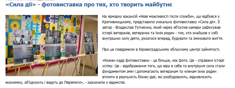 «Сила дії» – фотовиставка про тих, хто творить майбутнє // Кіровоград 24. – Режим доступу: https://kirovograd24.com/shortly/2025/11/14/-sila-dii-fotovistavka-pro-tih-hto-tvorit-maibutne.htm. – Дата публікації: 14.11.2025.