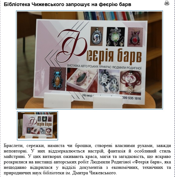 У бібліотеці Чижевського – виставка живопису // 21-й канал. – 2025. –16 січня. – С. 6 : фото.кол.