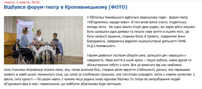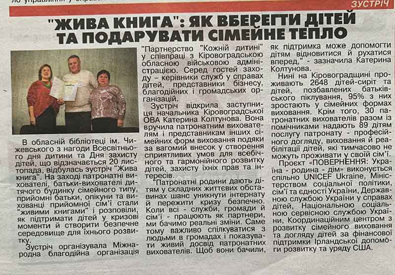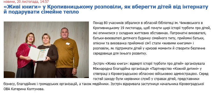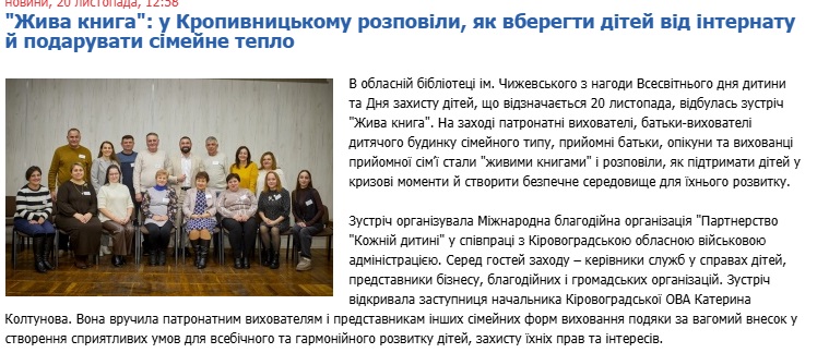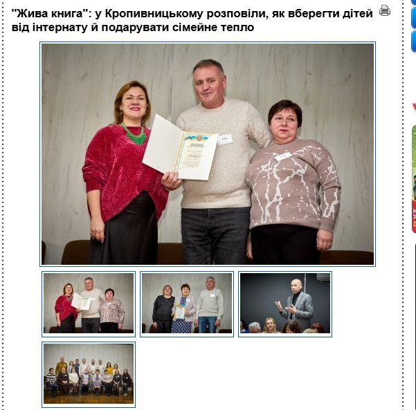 “Жива книга”: у Кропивницькому розповіли, як вберегти дітей від інтернату й подарувати сімейне тепло // Кіровоград 24. – Режим доступу: https://kirovograd24.com/shortly/2025/11/20/-zhiva-kniga-u-kropivnitskomu-rozpovili-jak-vberegti-ditei-vid-internatu-i-podaruvati-simeine-teplo.htm. – Дата публікації: 20.11.2025.