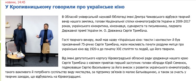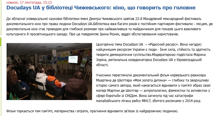 Docudays UA у бібліотеці Чижевського: кіно, що говорить про головне // Кіровоград 24. – Режим доступу: https://kirovograd24.com/shortly/2025/11/17/docudays-ua-u-bibliotetsi-chizhevskogo-kino-scho-govorit-pro-golovne.htm. – Дата публікації: 17.11.2025.