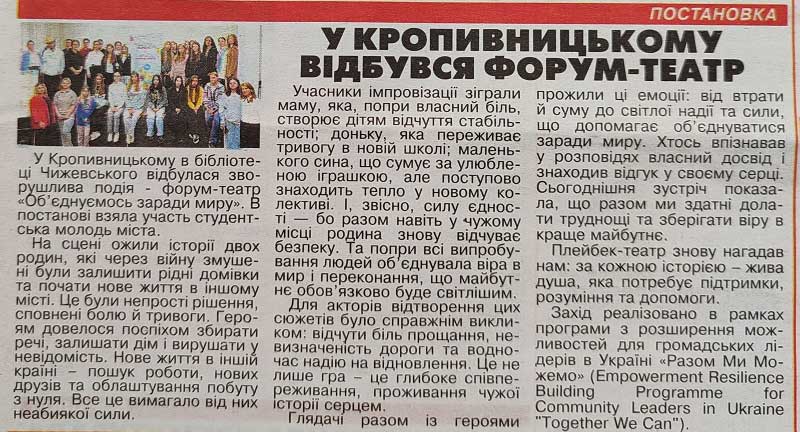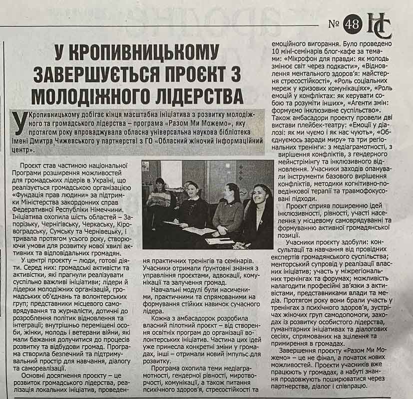 У Кропивницькому добігає кінця масштабна ініціатива з розвитку молодіжного та громадського лідерства – програма «Разом Ми Можемо», яку протягом року впроваджувала обласна універсальна наукова бібліотека імені Дмитра Чижевського у партнерстві з ГО «Обласний жіночий інформаційний центр».